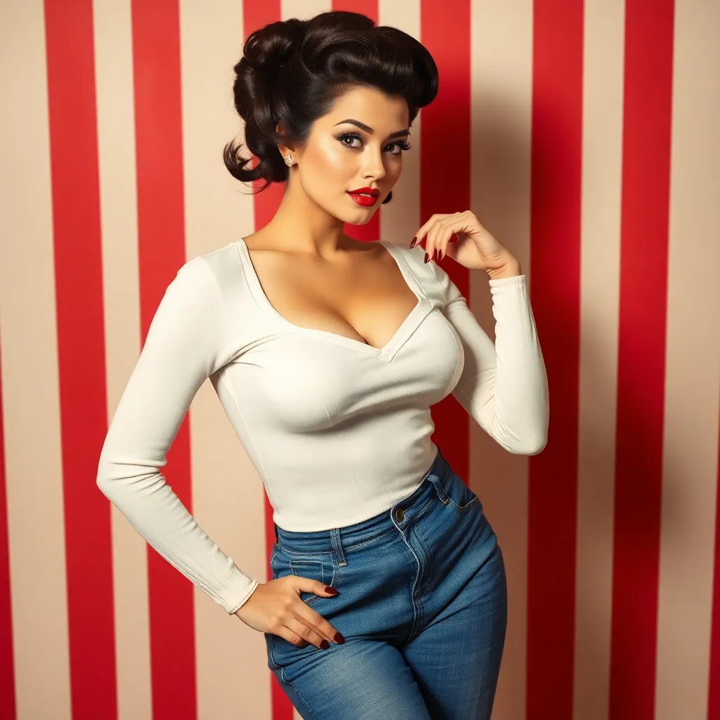 Create a sultry 1950s pin-up girl with a bouffant hairdo, cat-eye makeup, and a bright red lipstick. She's wearing a fitted white sweater with a sweetheart neckline, high-waisted blue jeans, and a pair of black heeled ankle boots. She's posing seductively against a vintage-style red and white striped backdrop.