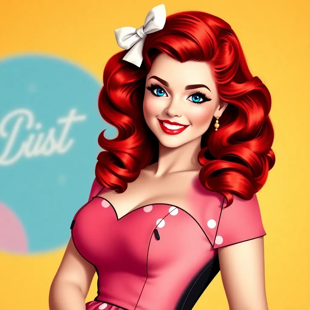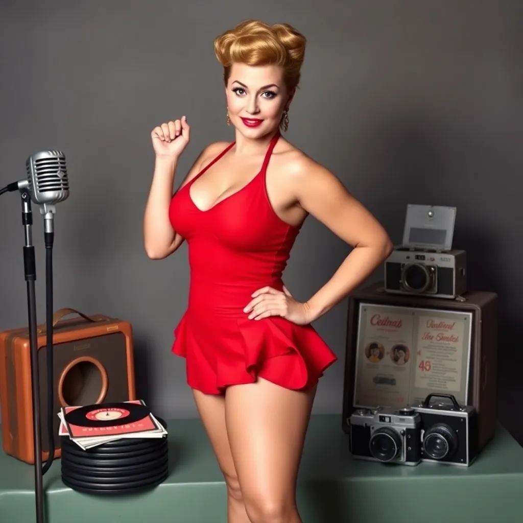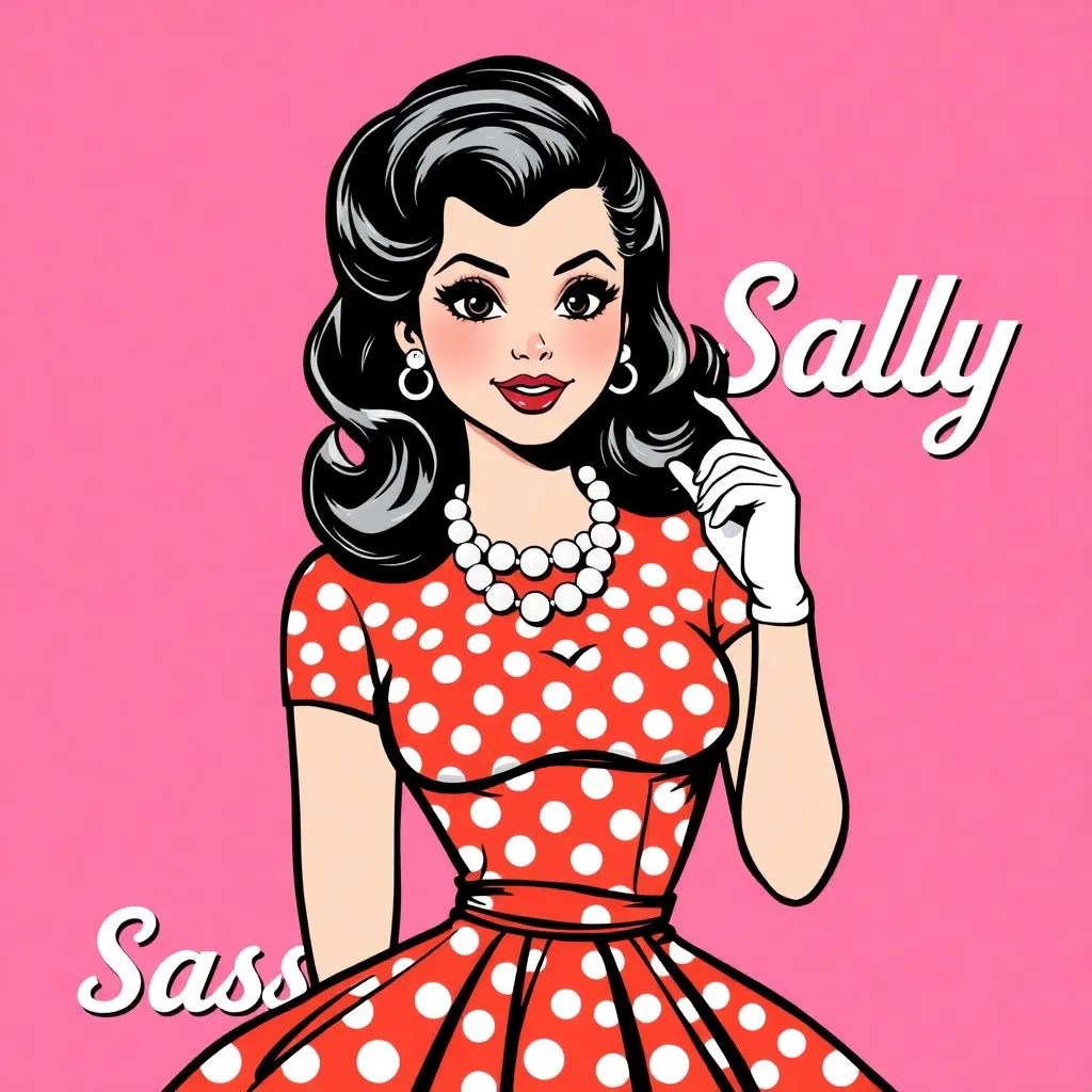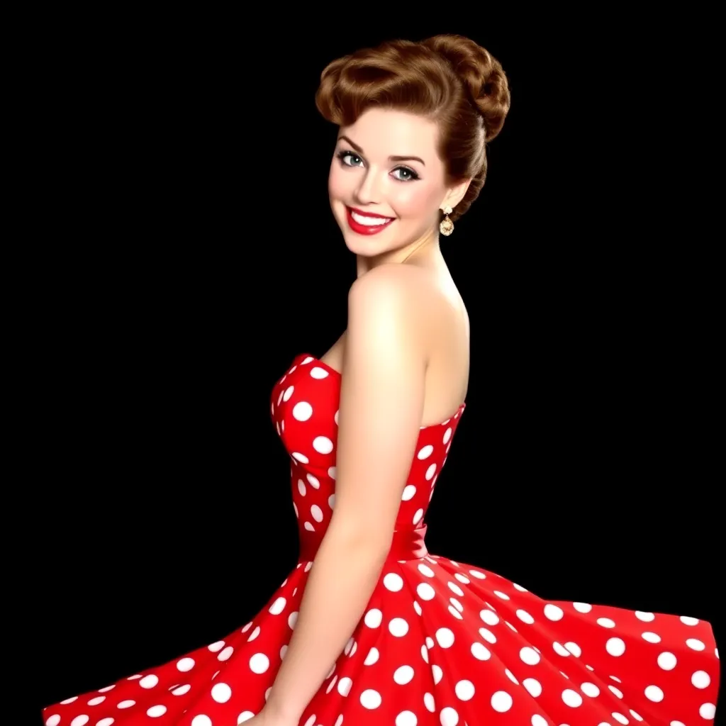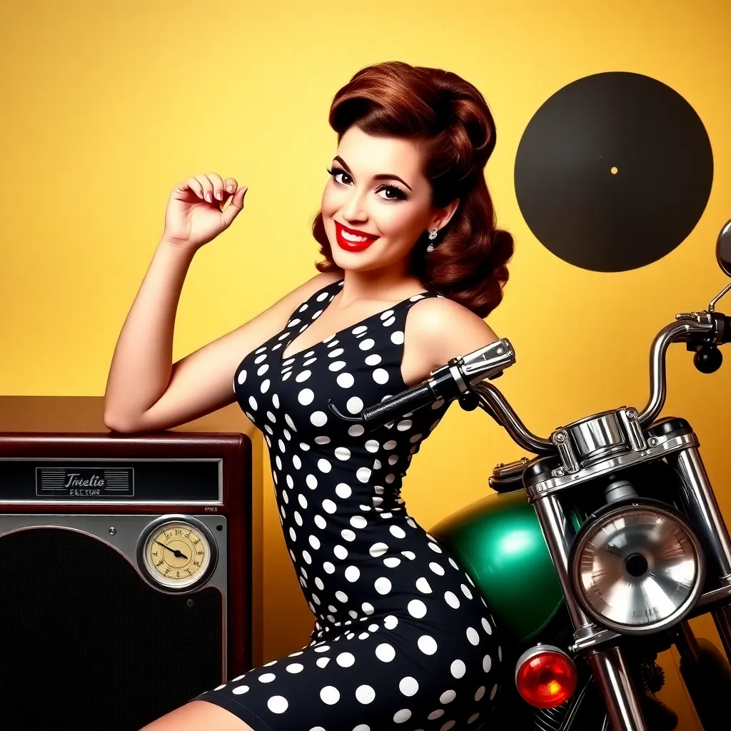 Create a vibrant 1950s-inspired Pin-Up Girl image featuring a curvy beauty with a signature bouffant hairstyle, bold red lipstick, and a fitted polka-dot dress. She's posed playfully, leaning against a retro-style record player or a sleek, chrome-trimmed motorcycle, with a cheeky grin and a flirtatious gaze.
