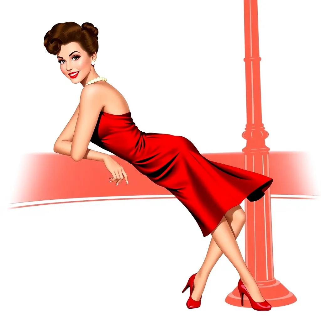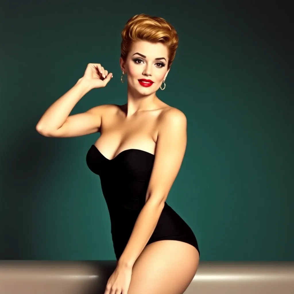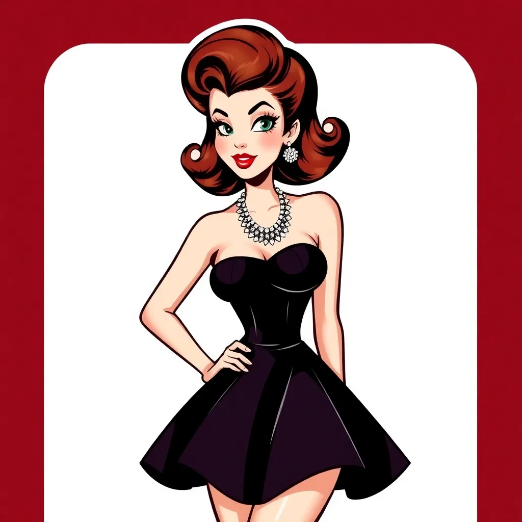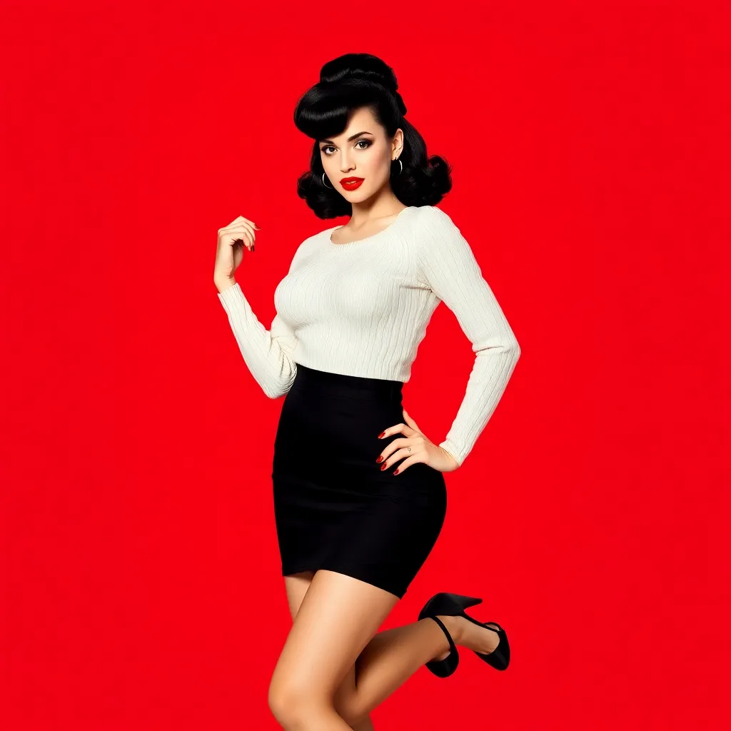 Capture the essence of 1950s glamour! Create a Pin-Up Girl with a sassy expression, bold red lips, and a signature bouffant hairstyle. She's dressed in a fitted, high-waisted black dress with a flared skirt, complete with a sparkling necklace and stiletto heels. Set against a retro-inspired background.