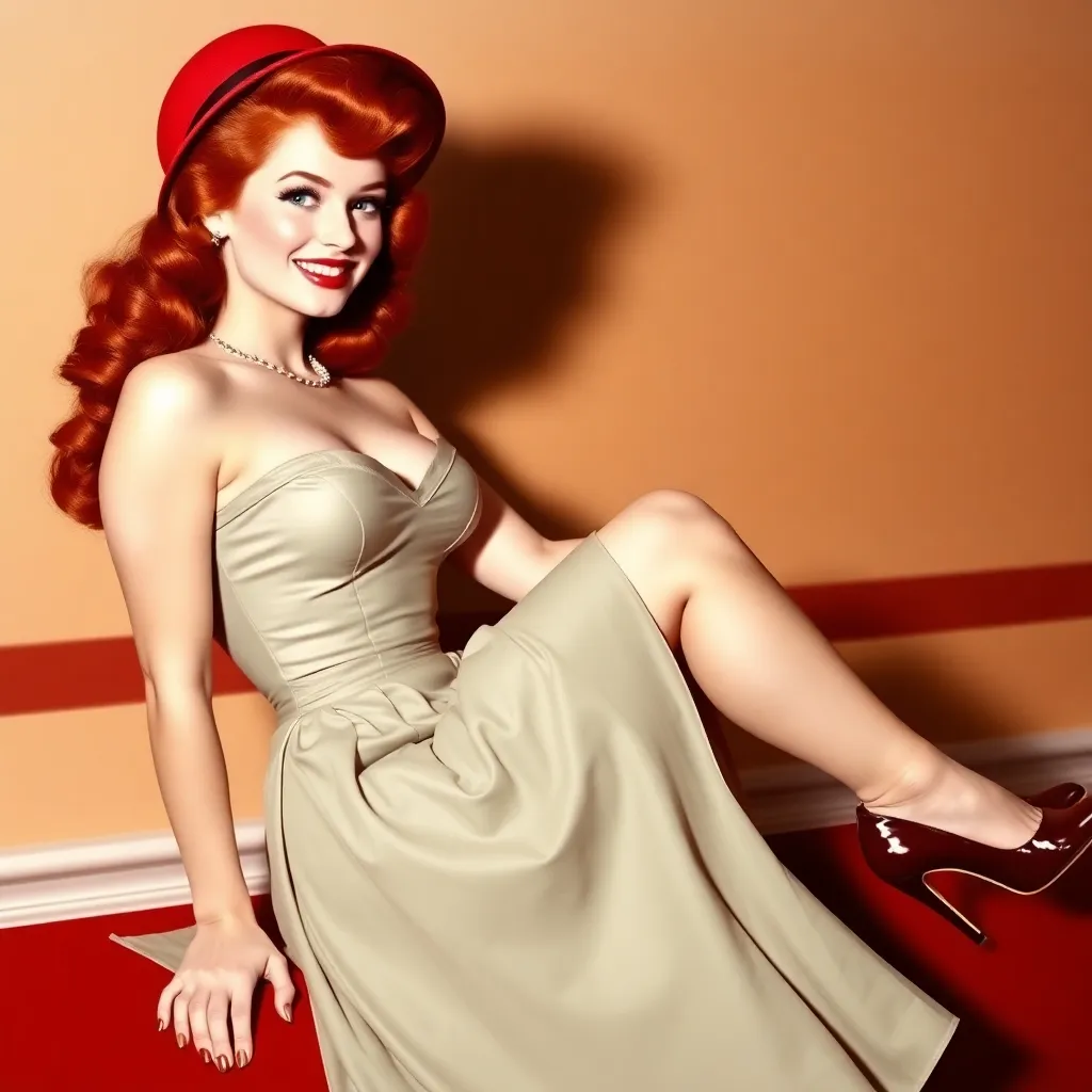 Create a stunning 1950s Pin-Up Girl, sassy and seductive. She's a bombshell beauty with luscious red hair, piercing green eyes, and a curvy figure. She's dressed in a fitted white swimsuit with a red sash, high heels, and a statement pearl necklace. Capture her in a playful pose, surrounded by vintage glamour.