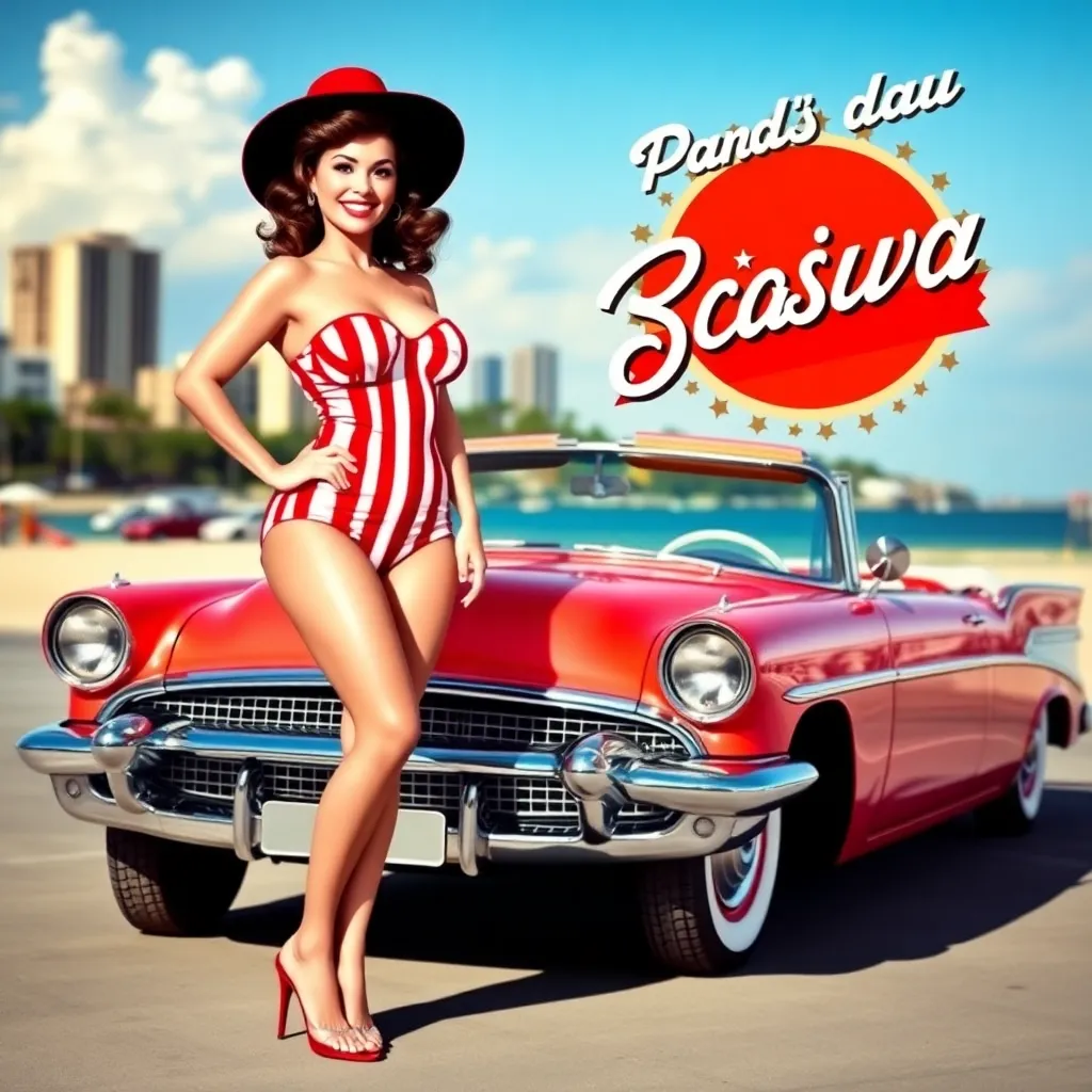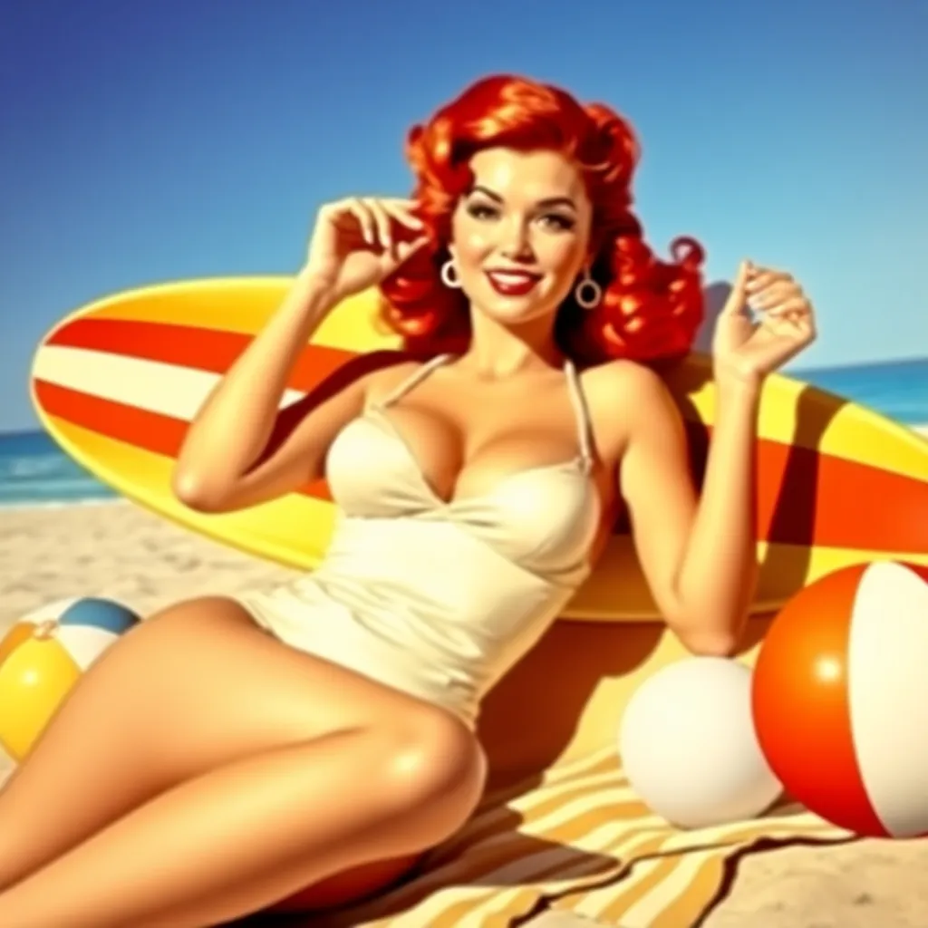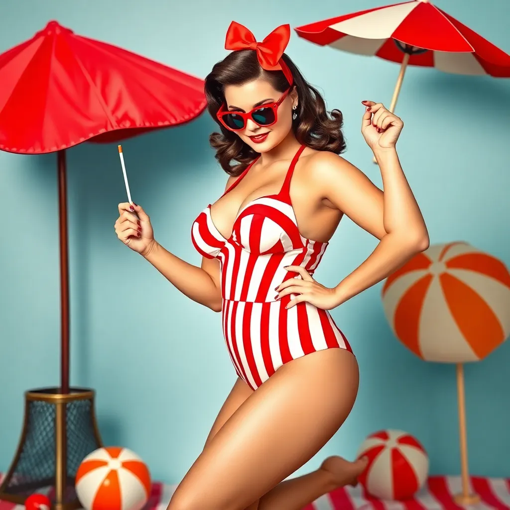 Create a stunning 1950s Pin-Up Girl pose, showcasing a sassy and alluring beauty with a signature bouffant hairdo, bold red lipstick, and a fitted, high-waisted swimsuit. Incorporate a playful, flirtatious expression and a subtle nod to the era's iconic style, complete with a vintage-inspired backdrop.