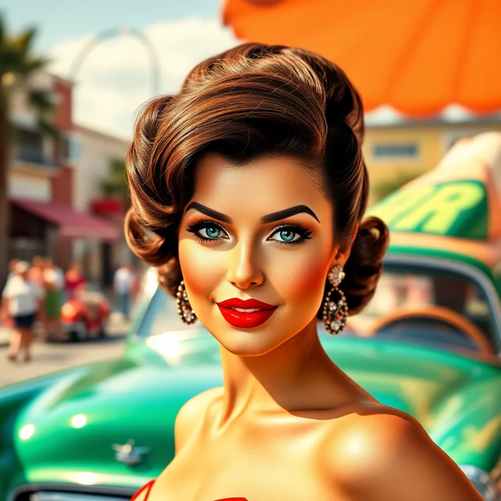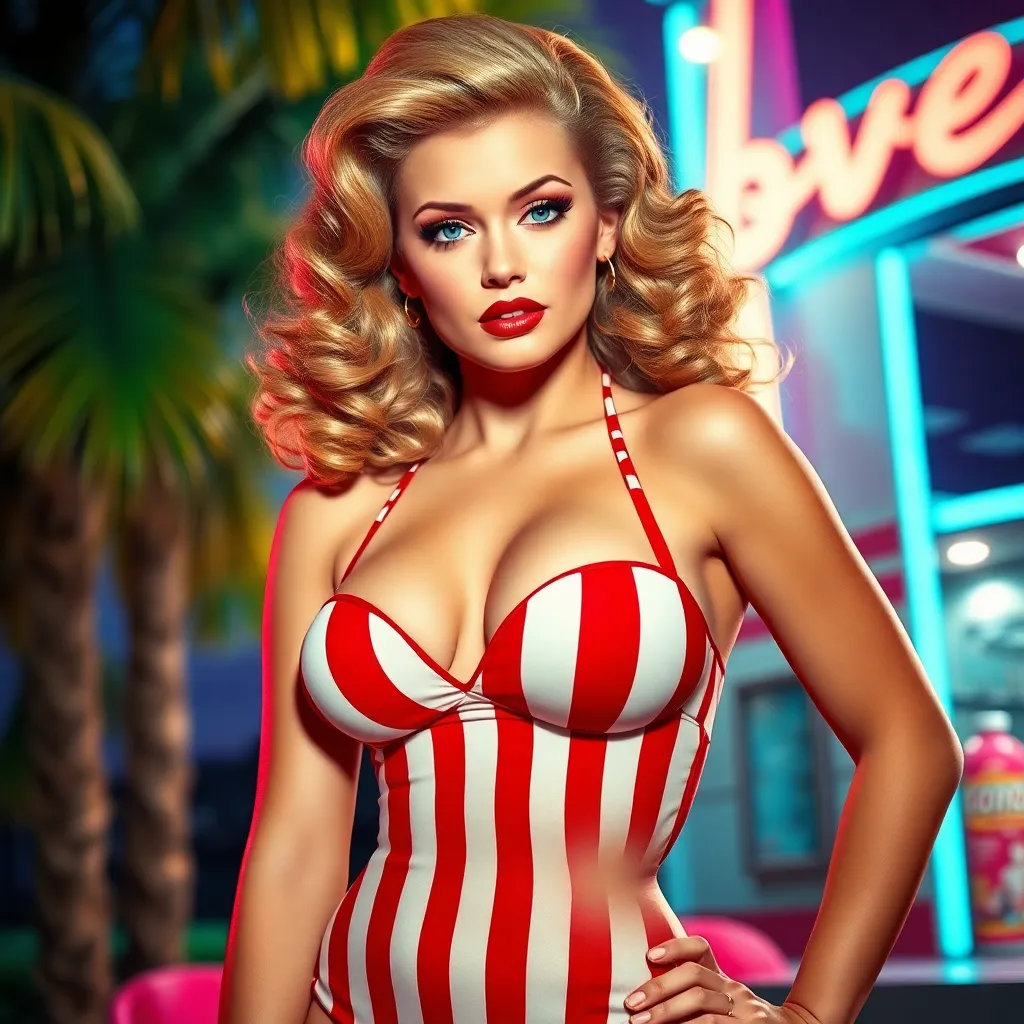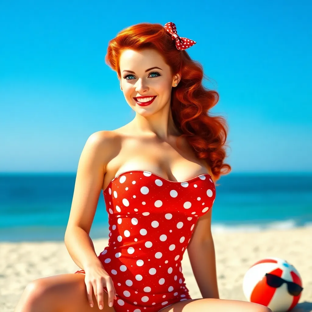 Create a stunning 1950s Pin-Up Girl pose, showcasing a sassy and alluring beauty with a signature bouffant hairdo, bold red lipstick, and a fitted, high-waisted swimsuit. Incorporate a playful, flirtatious expression and a subtle nod to the era's iconic style, complete with a vintage-inspired backdrop.