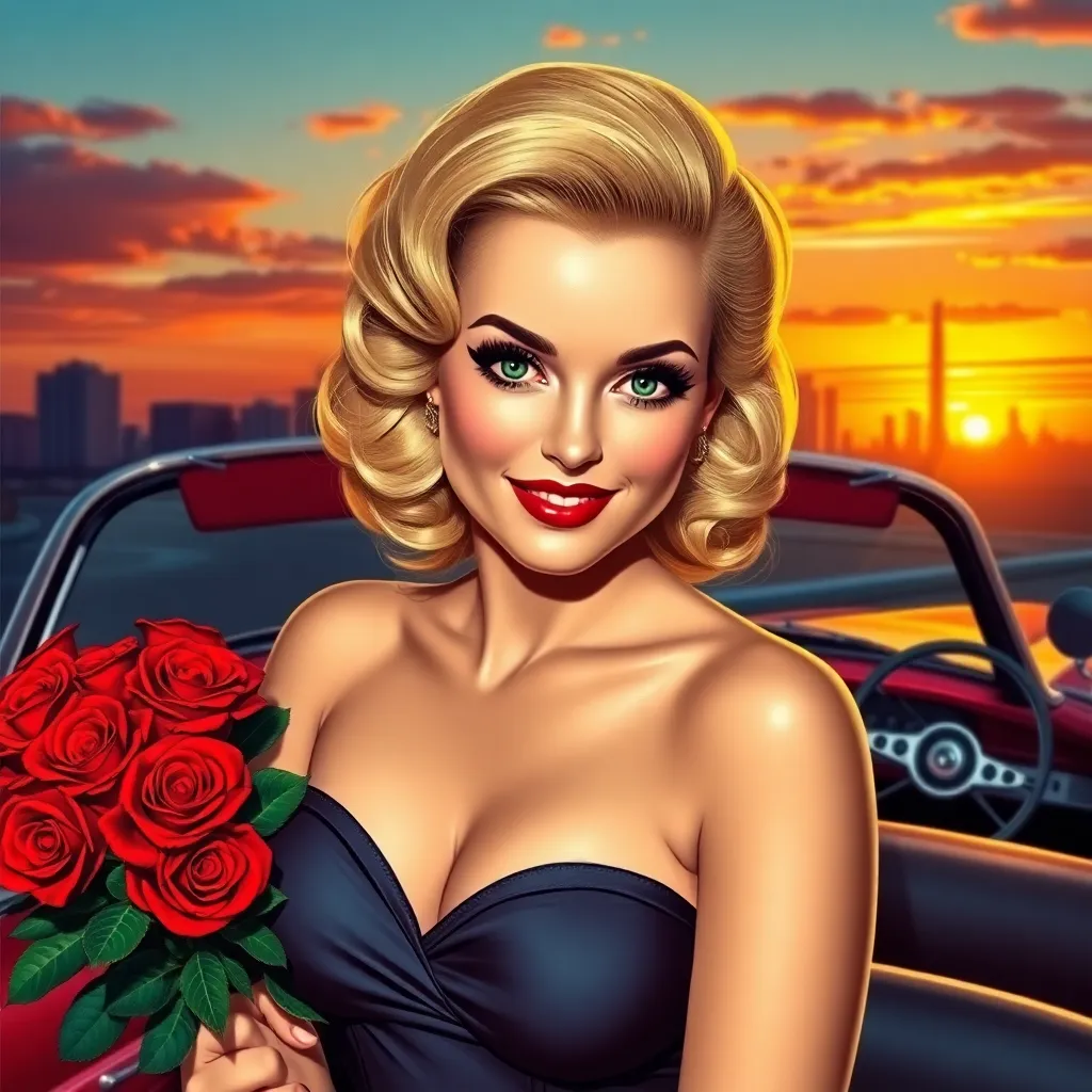 Create a stunning 1950s Pin-Up Girl, reminiscent of icons like Betty Grable and Marilyn Monroe. She should be standing in front of a bright red convertible, wearing a fitted white with dress a full skirt, a red belt, and a matching hat. Her hair should be styled in a glamorous updo, and she should be striking a sassy pose with one hand on her hip and the other holding a cigarette.