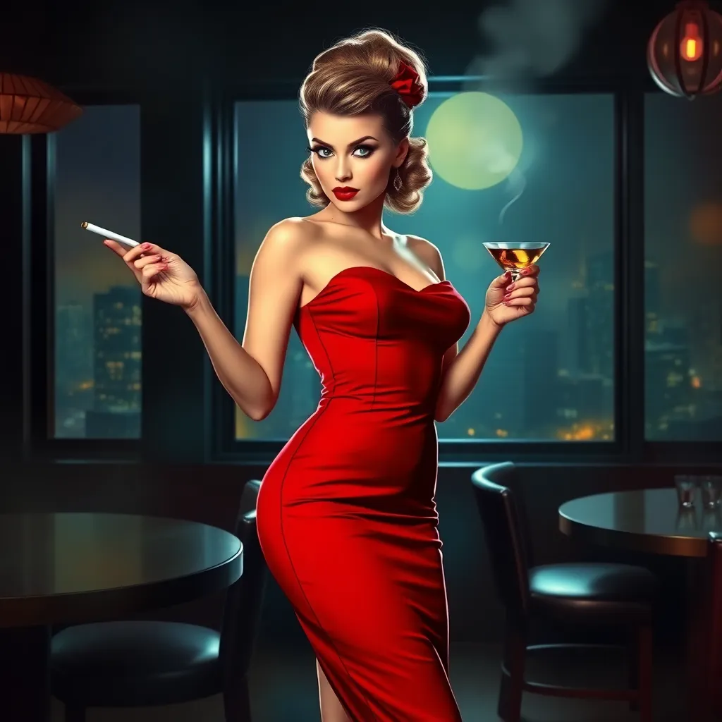 Imagine a stunning 1950s Pin-Up Girl, posing seductively on a red velvet couch, surrounded by vintage cigarette boxes and champagne bottles. Her luscious blonde hair cascades down her back, and her sparkling blue eyes gaze directly at the viewer. She's dressed in a fitted, high-waisted red dress with a full skirt, complete with a sweetheart neckline and a pair of gloves. The atmosphere is sultry and sophisticated, with a hint of old-school Hollywood glamour.