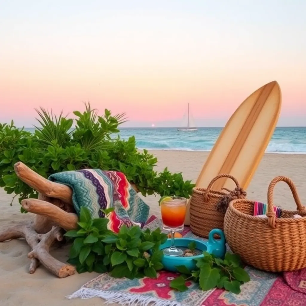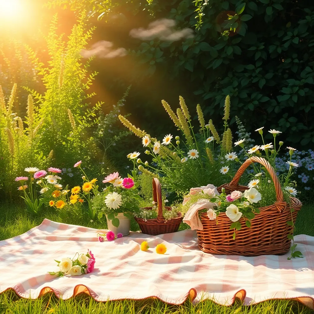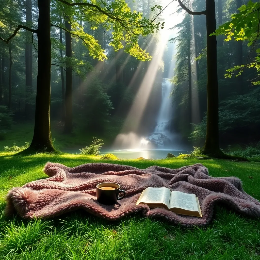 Create an enchanting scene for a relaxing Aesthetic Weekend Vibes. Imagine a serene forest glade, surrounded by towering trees, a tranquil lake, and a warm sunset glow. Incorporate soft, pastel colors and whimsical elements like wildflowers, a vintage picnic blanket, and a few scattered clouds. Let the serenity unfold.
