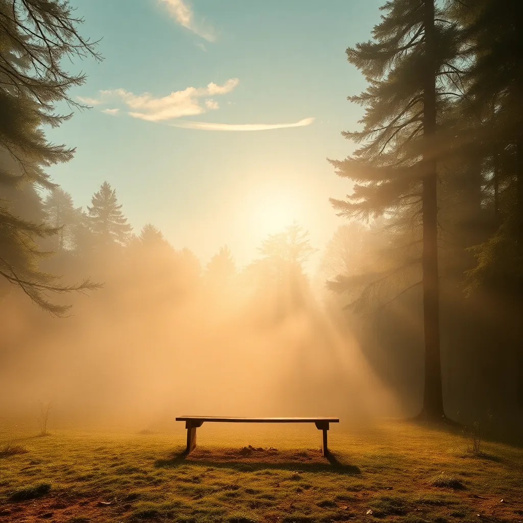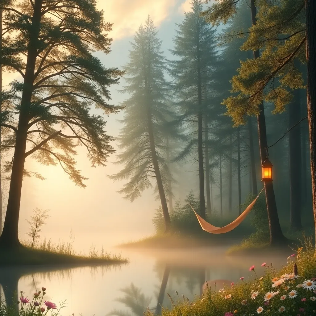 Create a serene and dreamy scene for a relaxing weekend getaway. Imagine a misty forest with towering trees, a tranquil lake, and a warm golden light filtering through the clouds. Incorporate soft, pastel colors and whimsical details like wildflowers, lanterns, or a hammock. Capture the essence of a peaceful retreat.