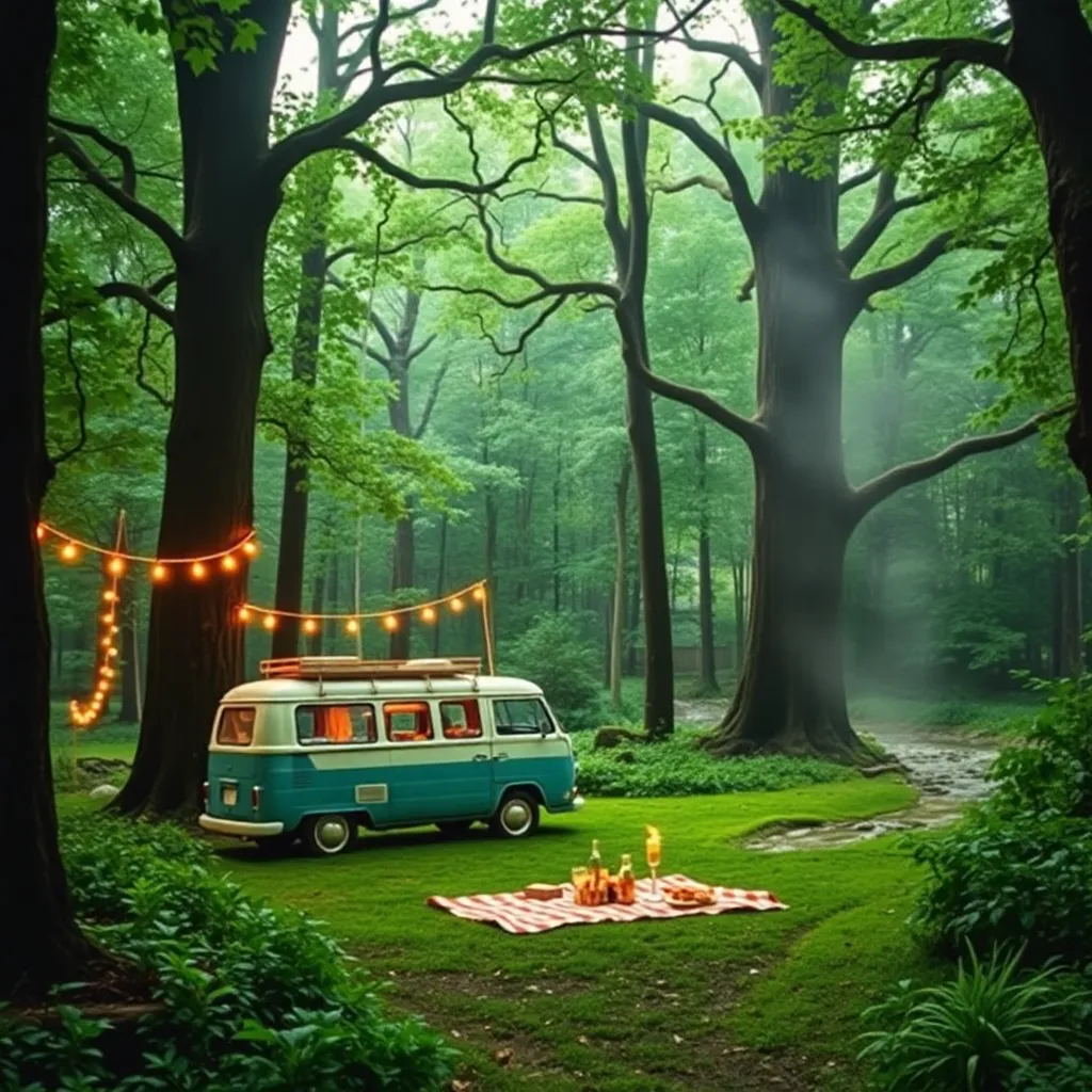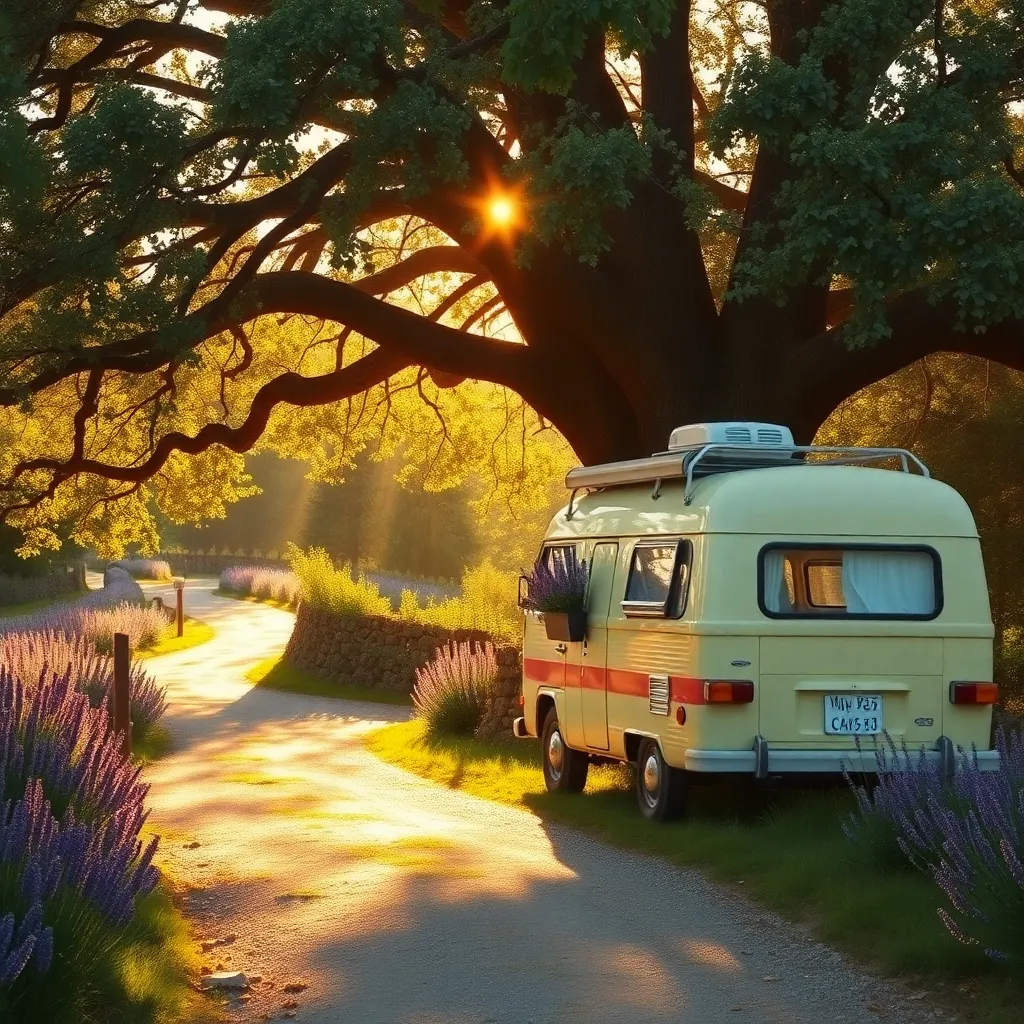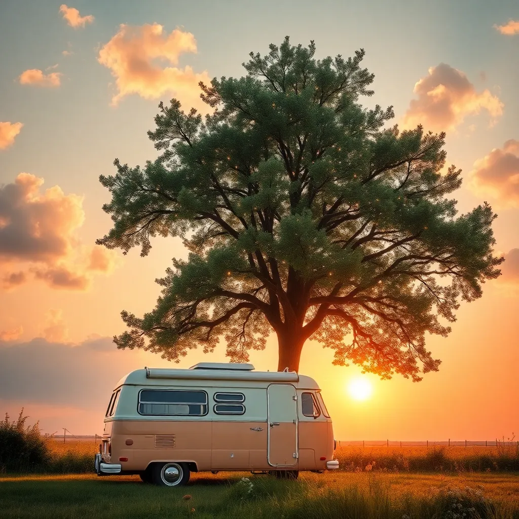 Imagine a serene summer afternoon. A majestic tree, its branches adorned with twinkling fairy lights, stands tall against a warm orange sunset. Soft, fluffy clouds drift lazily across the sky. A vintage camper van, painted in pastel hues, is parked beneath the tree, surrounded by lush greenery and a scattering of wildflowers.