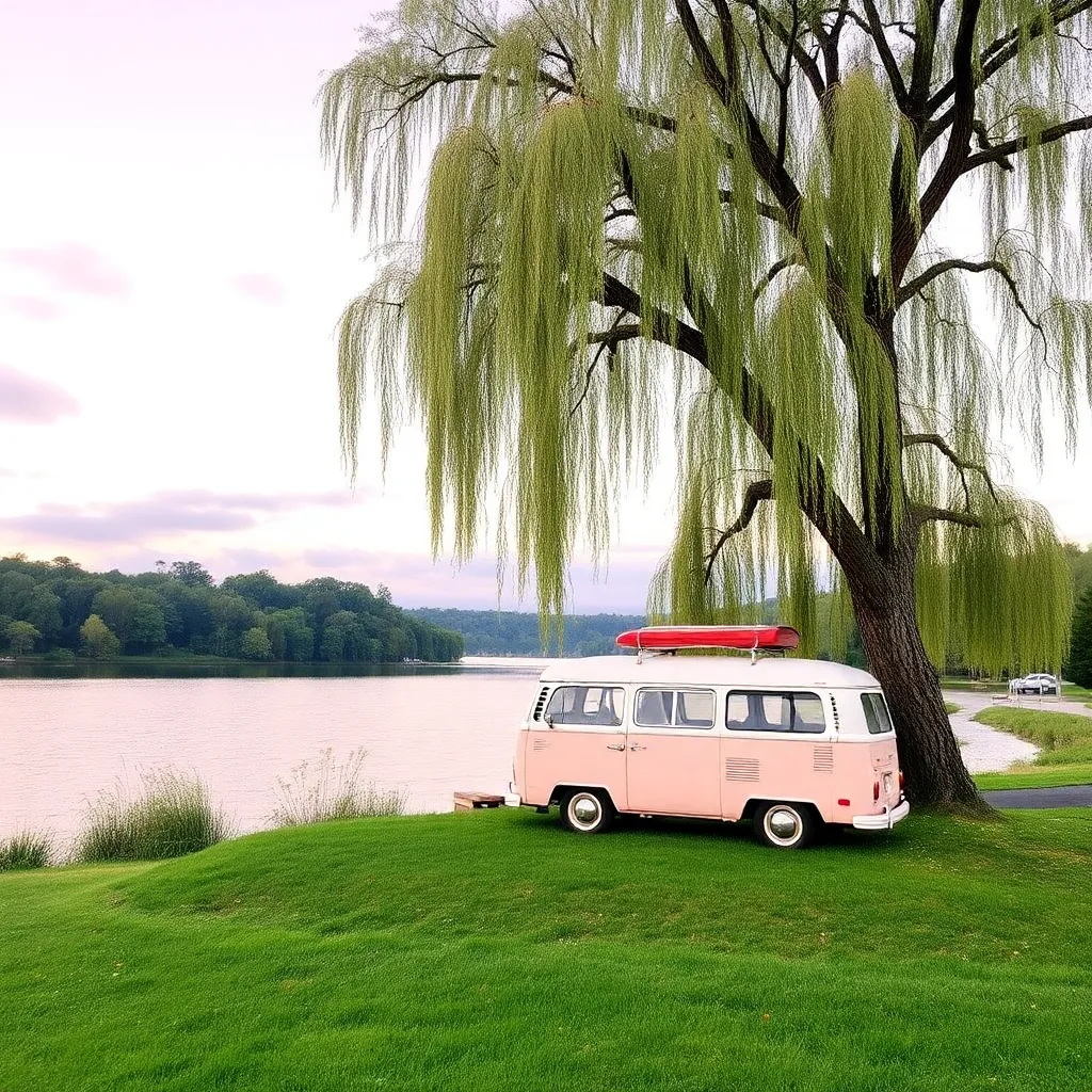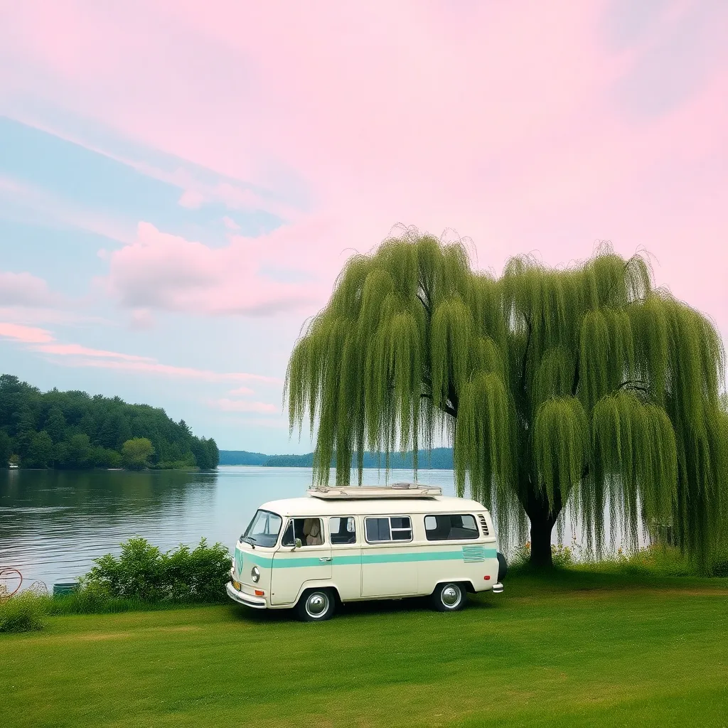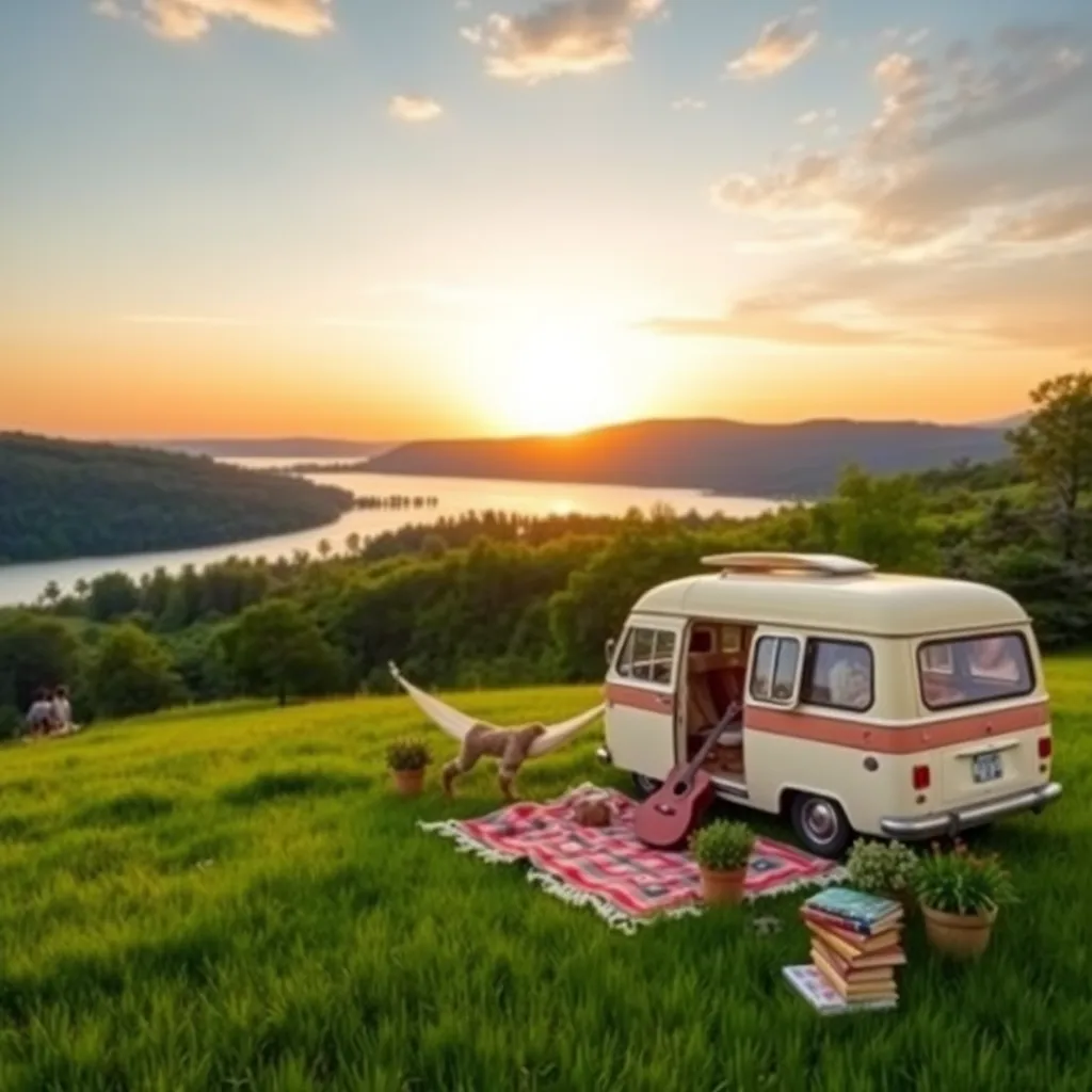 Imagine a serene summer afternoon. A majestic tree, its branches adorned with twinkling fairy lights, stands tall against a warm orange sunset. Soft, fluffy clouds drift lazily across the sky. A vintage camper van, painted in pastel hues, is parked beneath the tree, surrounded by lush greenery and a scattering of wildflowers.