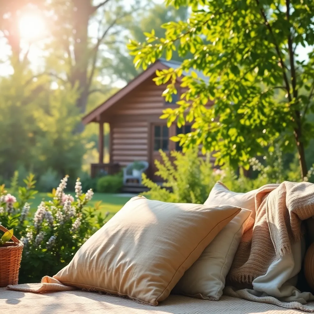 Create a serene and inviting scene for an Aesthetic Weekend Vibes image. Imagine a warm sunny day with a gentle breeze rustling the leaves of a lush greenery-filled garden, a soft focus on a cozy cabin in the background, and a few strategically placed throw pillows and blankets in a calming color palette.