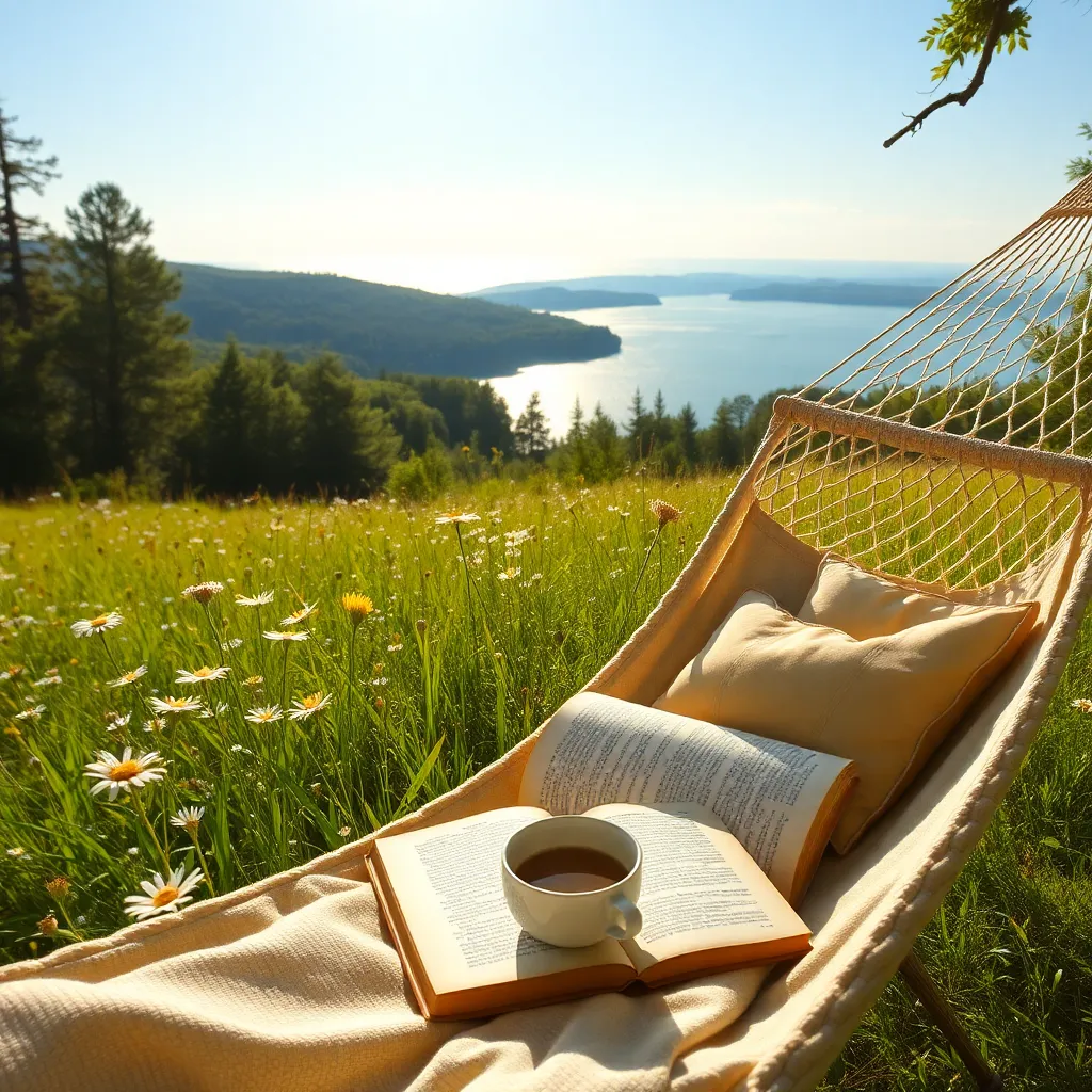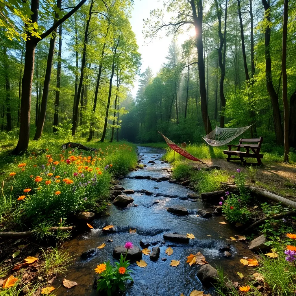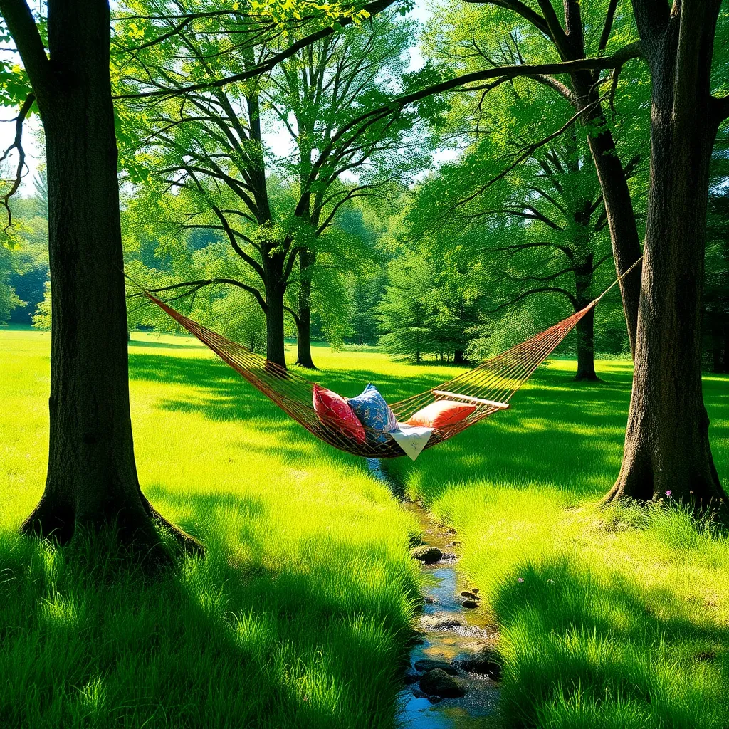 Capture the essence of a serene weekend getaway. Imagine a lush, green meadow surrounded by towering trees, with a warm sun shining down. A hammock is slung between two trunks, adorned with a few colorful pillows and a good book. A gentle stream runs through the meadow, its soft gurgling a soothing background melody.