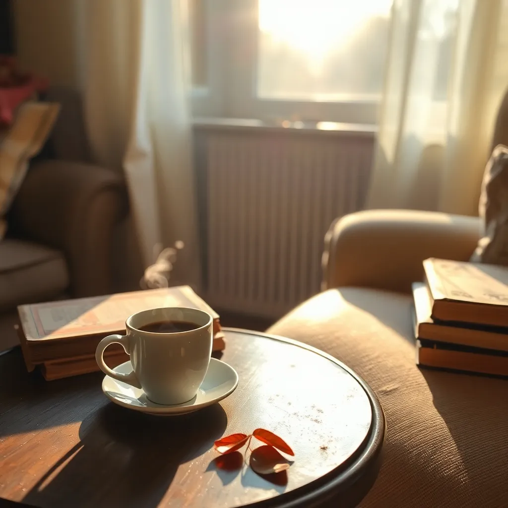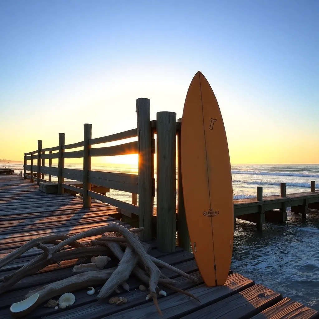 Imagine a serene weekend getaway to a secluded coastal town. Soft, warm light filters through the fog, casting a golden glow on the rustic pier. Seagulls soar overhead, while the sound of gentle waves and distant jazz music fill the air. Capture the tranquil atmosphere and whimsical charm of this idyllic escape.