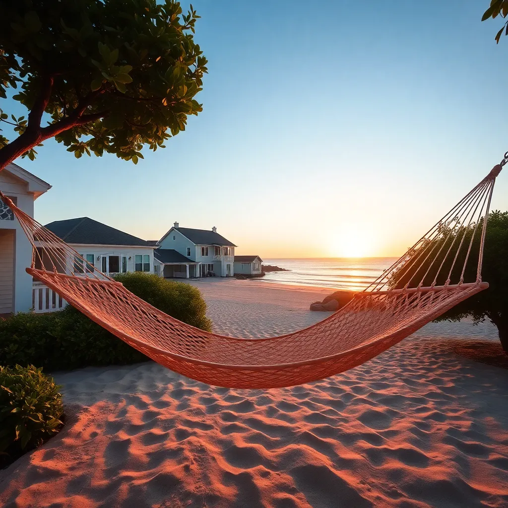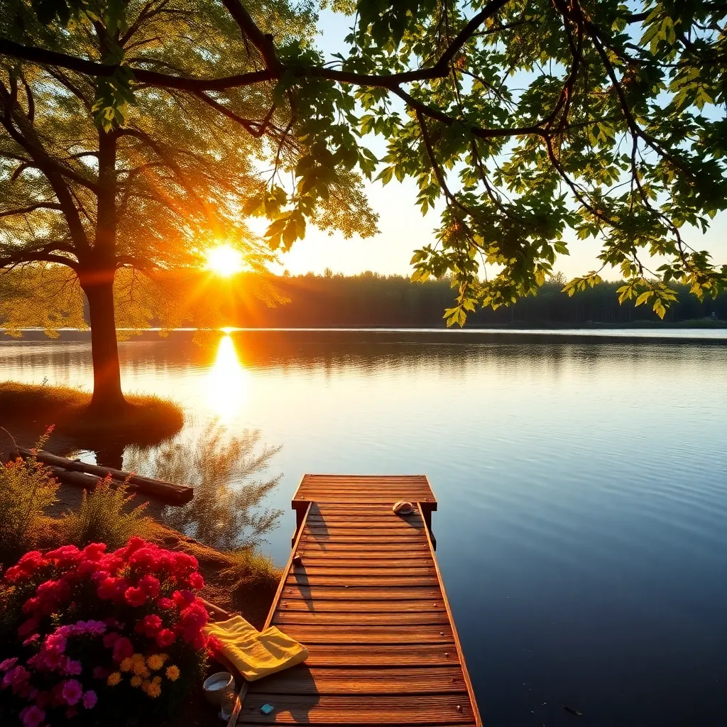 Imagine a serene weekend getaway to a secluded lakehouse. The sun is setting over the calm waters, casting a warm golden glow. A hammock swings gently in the breeze, surrounded by lush greenery and vibrant wildflowers. The air is filled with the sweet scent of blooming lavender and the sound of chirping crickets.