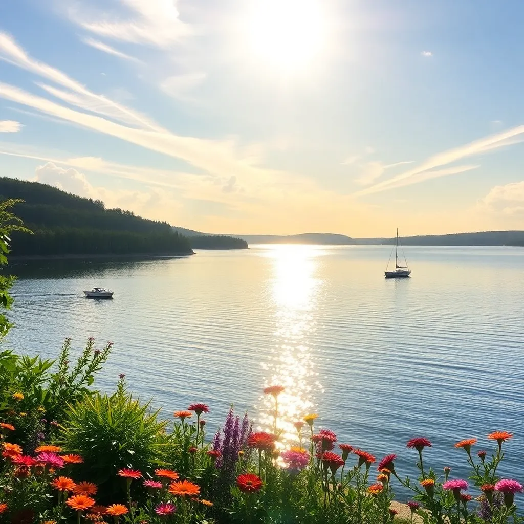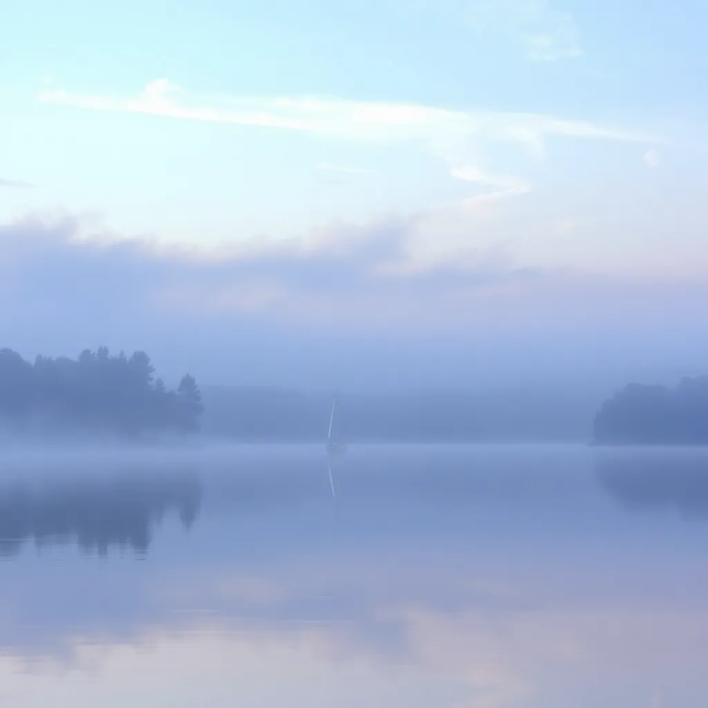 Capture the essence of a serene weekend morning. Imagine a tranquil lake surrounded by lush greenery, with a few wispy clouds drifting lazily across the sky. A small sailboat glides effortlessly across the water, leaving a trail of ripples behind. The atmosphere is calm, peaceful, and inviting, perfect for a relaxing weekend getaway.