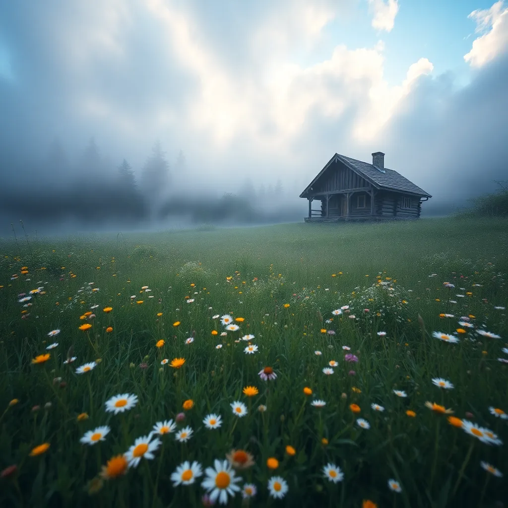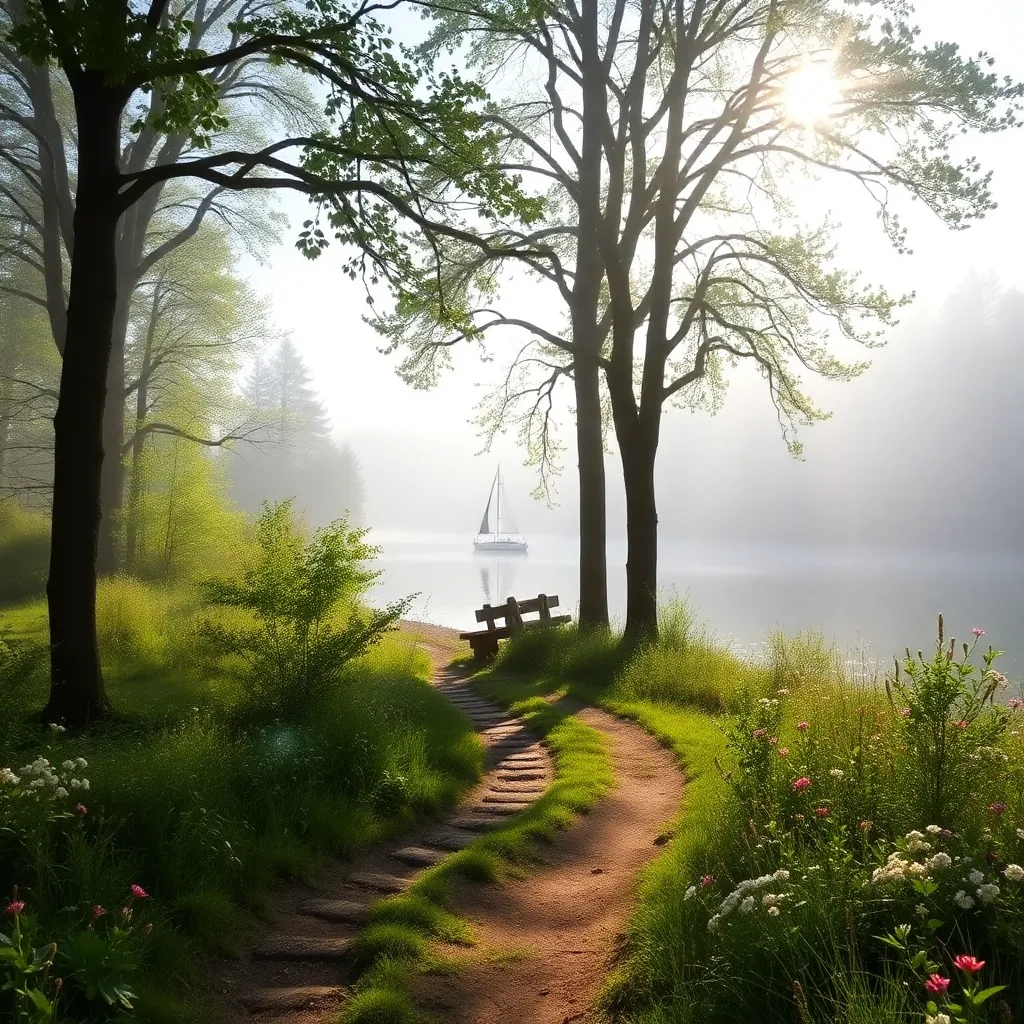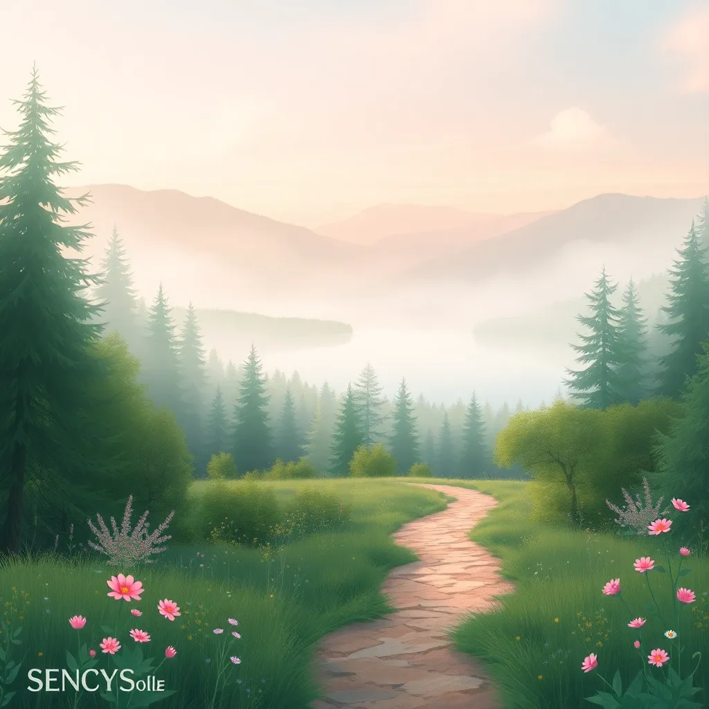 Create a serene and whimsical scene for a relaxing weekend getaway. Imagine a misty morning in a lush forest, with a winding path leading to a serene lake. Incorporate soft pastel colors, delicate wildflowers, and a few wispy clouds drifting lazily across the sky. Capture the tranquil atmosphere and invite the viewer to unwind.