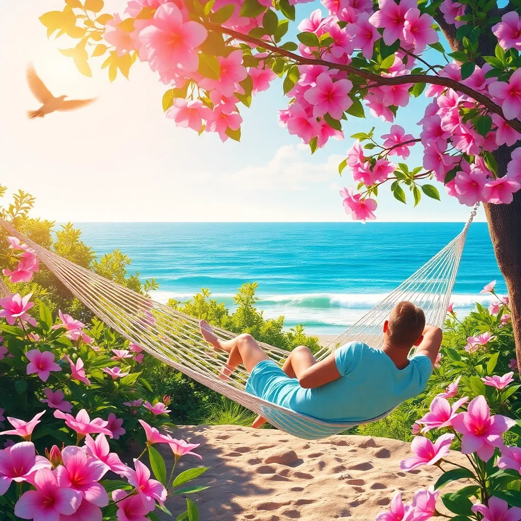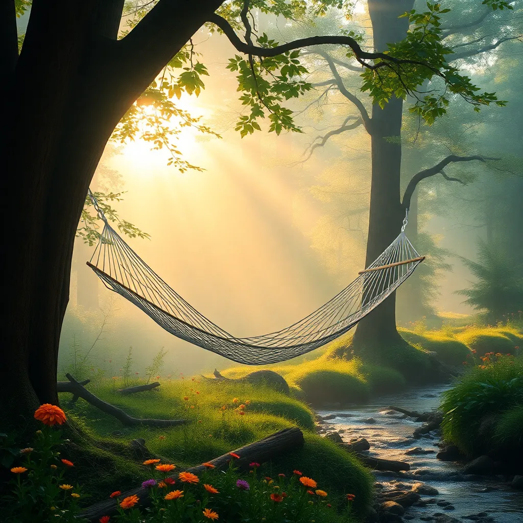 Create an image that captures the essence of a serene Aesthetic Weekend Vibes. Imagine a peaceful morning in a lush forest, with soft morning light filtering through the trees. A comfortable hammock is suspended between two ancient trunks, adorned with lush greenery and a few strategically placed flowers. The atmosphere is calm and inviting.