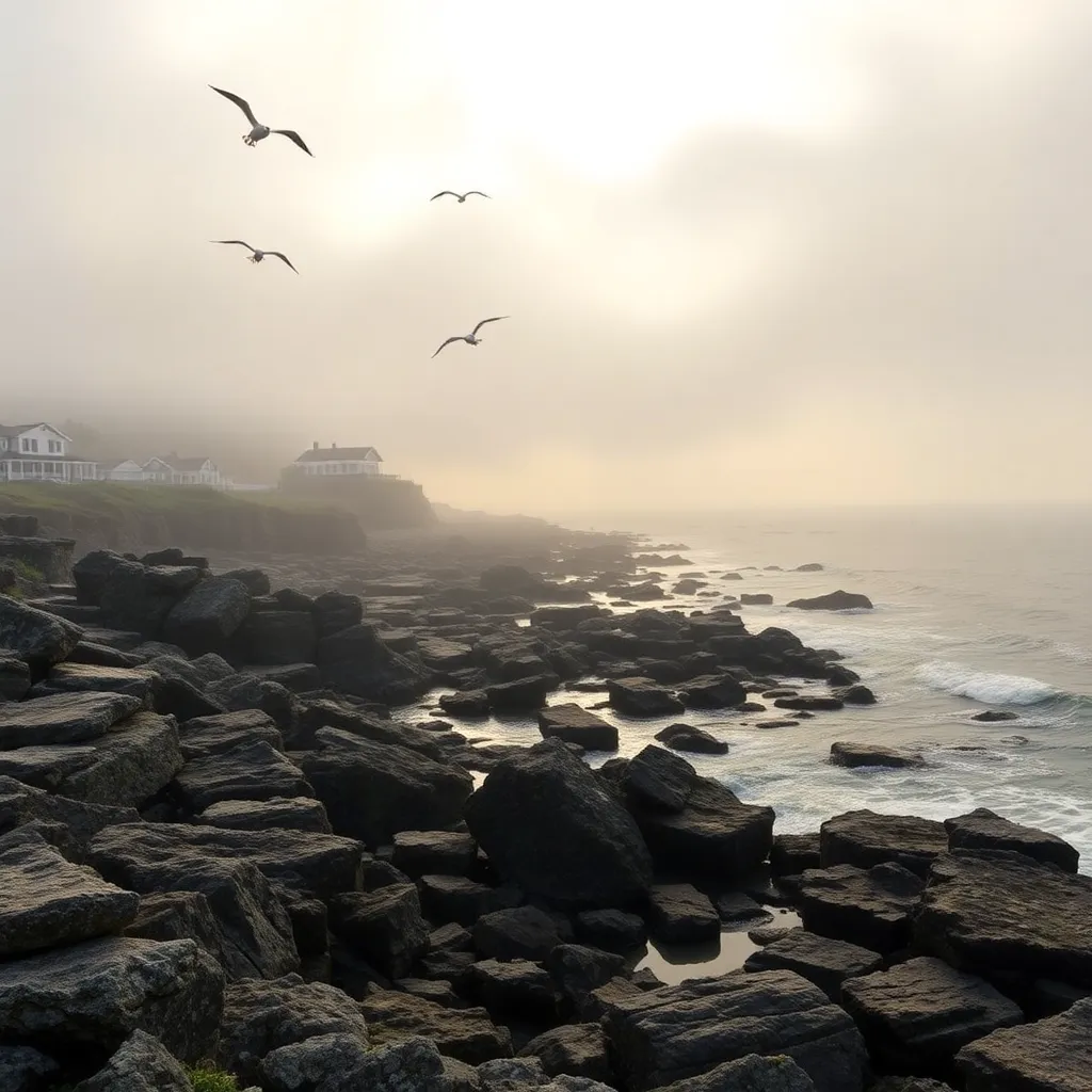 Imagine a serene weekend getaway to a secluded coastal town. Soft, golden light filters through the fog, casting a warm glow on the rugged shoreline. Seagulls soar overhead, and the sound of waves gently lapping against the rocks creates a soothing melody. Capture the tranquil atmosphere in a dreamy landscape.