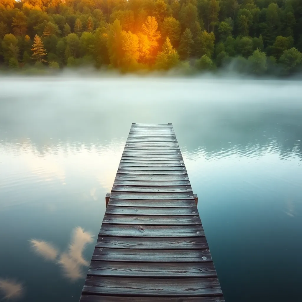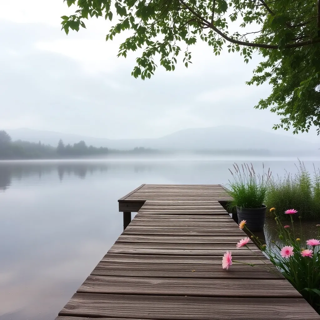 Capture the essence of a relaxing weekend getaway. Imagine a serene lakeside retreat with a hint of bohemian charm. Soft focus on the misty morning lake, surrounded by lush greenery and a vintage wooden dock. Incorporate pastel hues, wispy clouds, and a few strategically placed flowers for a dreamy atmosphere.
