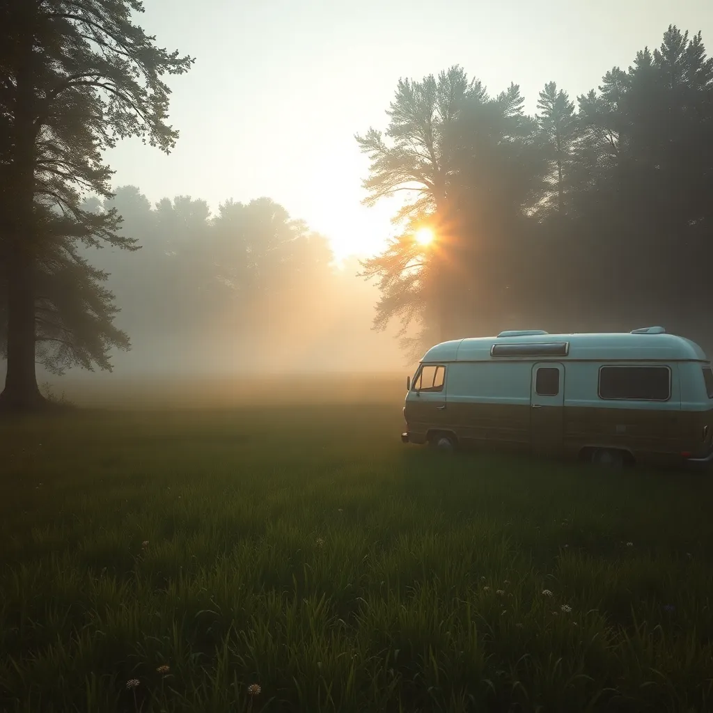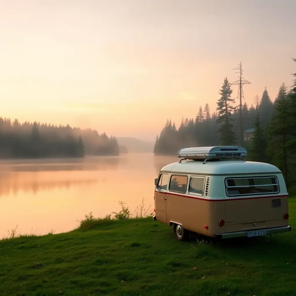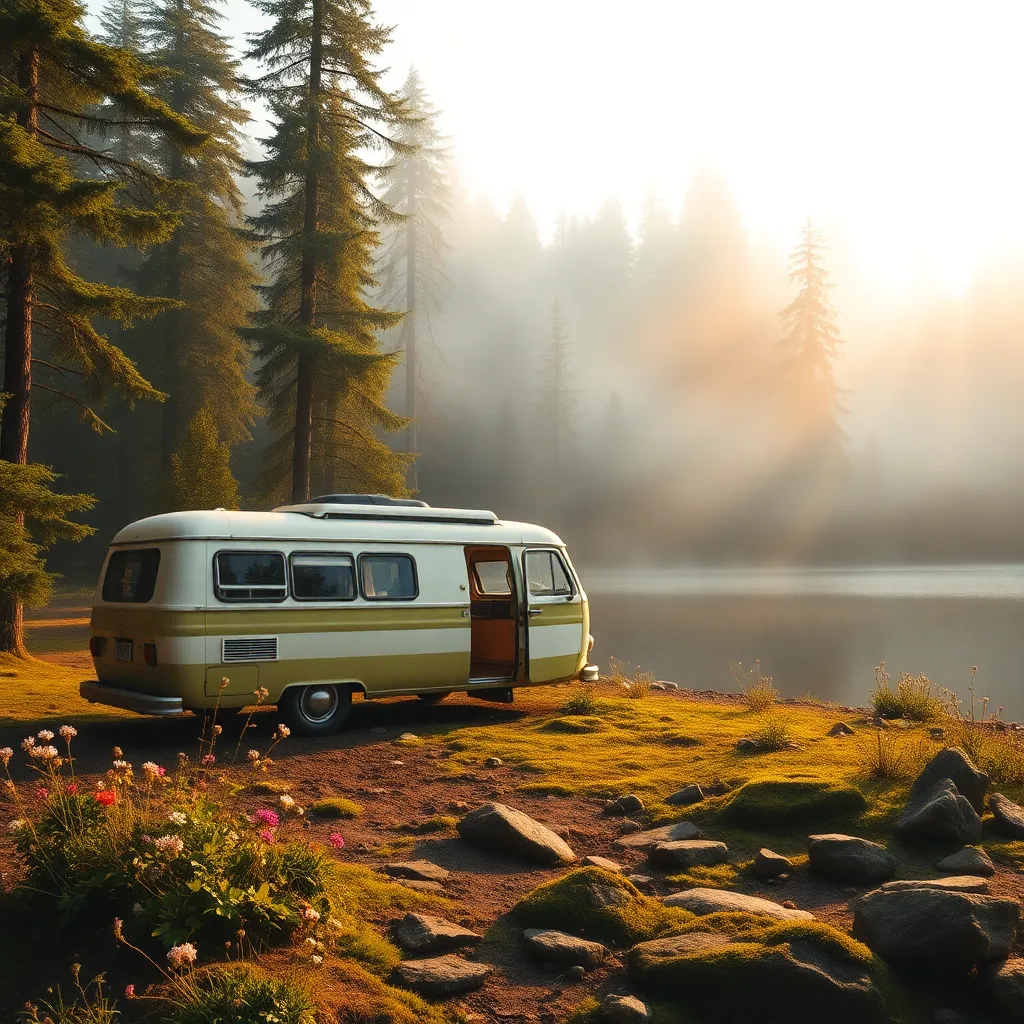 Create a serene and whimsical scene for a relaxing weekend getaway. Imagine a misty morning in a lush forest, with a warm golden light filtering through the trees. A vintage camper van is parked by a tranquil lake, surrounded by wildflowers and a scattering of moss-covered stones. Capture the essence of a peaceful retreat.