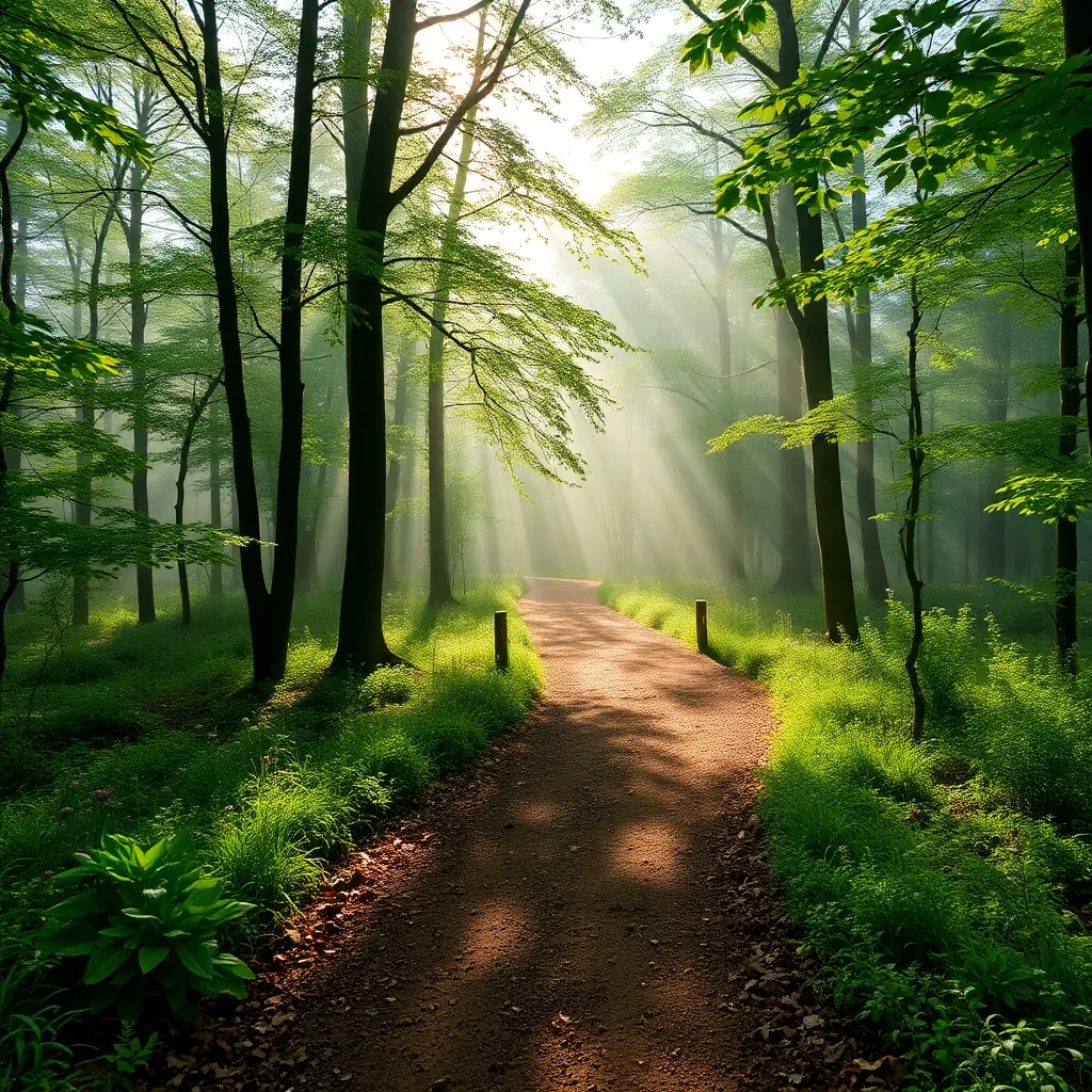 Capture the essence of a serene weekend getaway. Imagine a misty morning in a lush forest, with dappled sunlight filtering through the trees. A winding dirt path stretches out before you, lined with wildflowers and the soft rustle of leaves. The air is crisp and clean, filled with the scent of fresh earth.