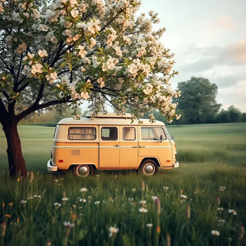 Create a serene and stylish scene for an Aesthetic Weekend Vibes image. Imagine a lush greenery-filled meadow with a vintage camper van parked under a blooming tree, surrounded by wildflowers and a few wispy clouds. Incorporate warm, pastel colors and subtle bokeh for a dreamy, Instagram-worthy atmosphere.