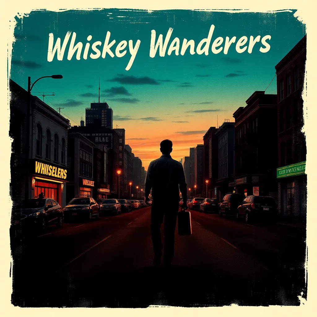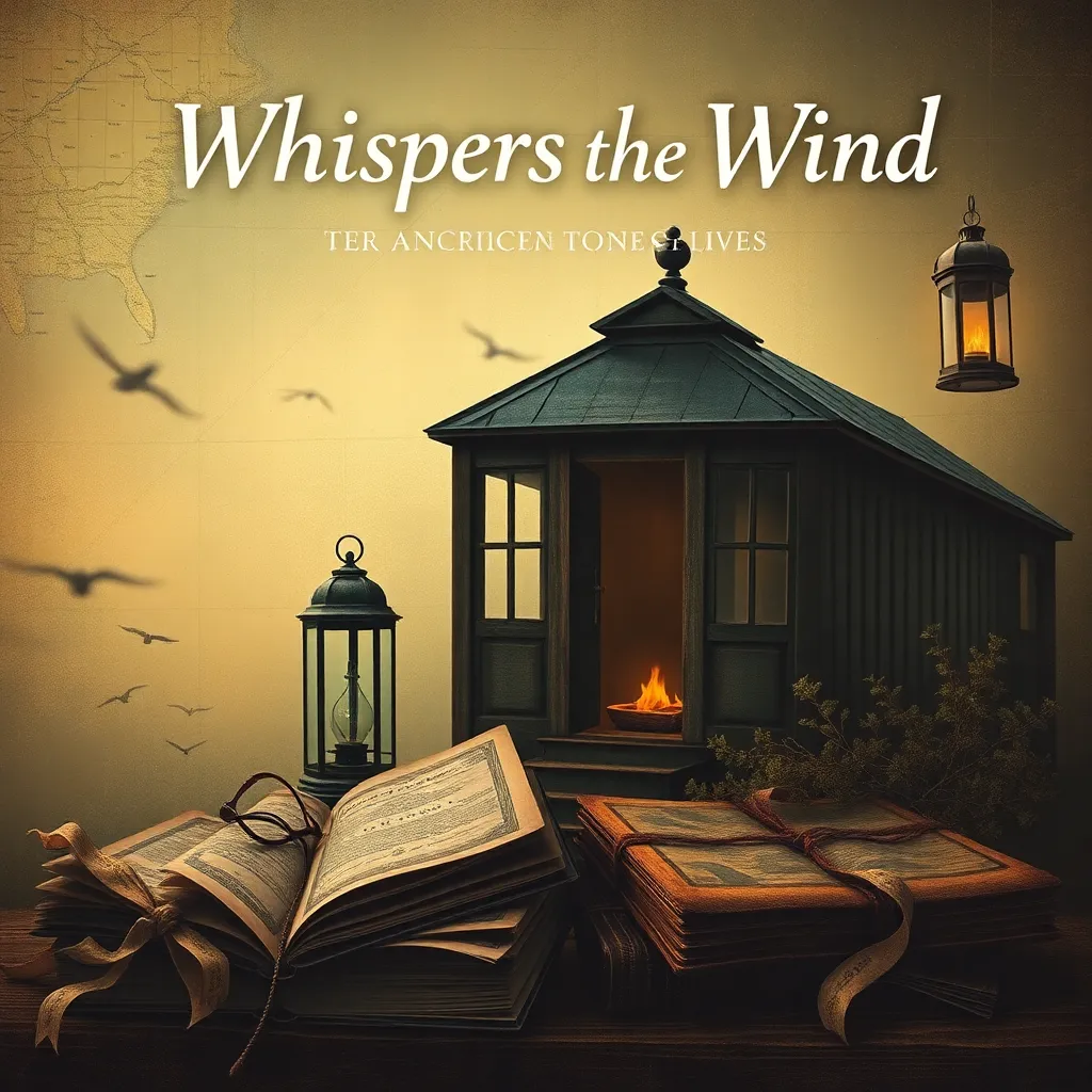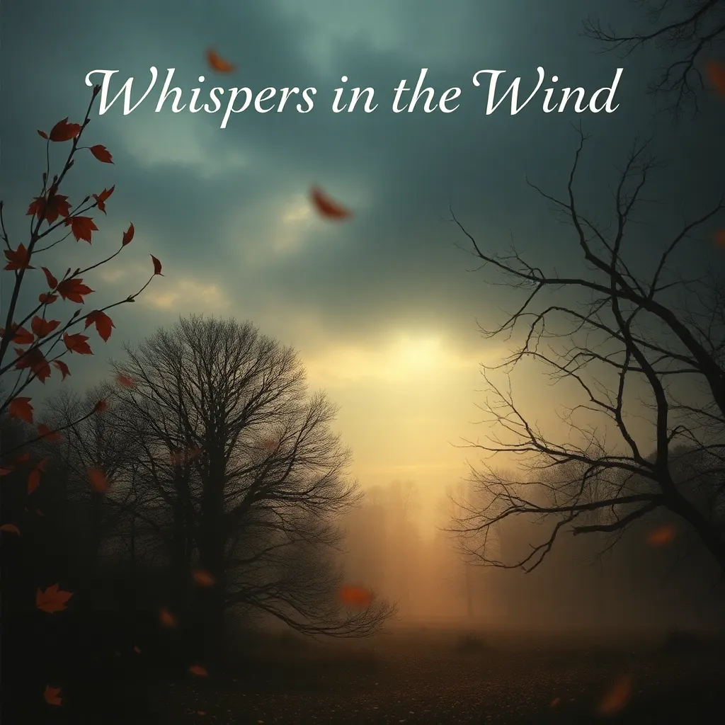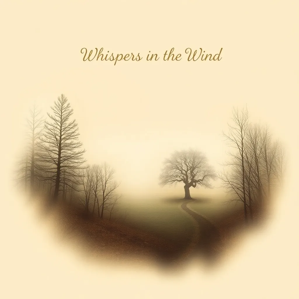 Create an album cover for a fictional indie-folk band called 'Whispers in the Wind' that captures the essence of a moody, autumnal evening. Incorporate elements of nature, such as leaves, trees, and misty skies, with subtle hints of nostalgia and longing. The cover should evoke a sense of wistful introspection.