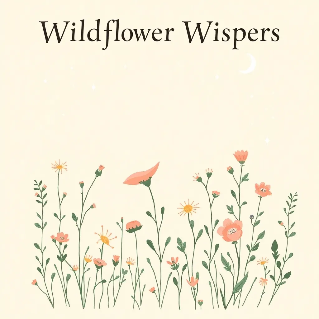 Create an album cover for a fictional indie-folk band 'Wildflower Whispers' with a whimsical, nature-inspired design. Incorporate elements like blooming flowers, twinkling stars, and a crescent moon to evoke a sense of enchantment and nostalgia. The color palette should be soft and earthy, with shades of green, beige, and blue.