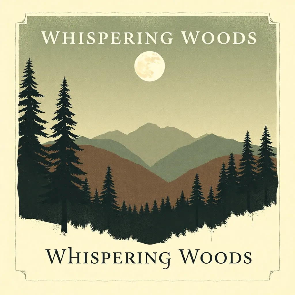 Create an album cover for a fictional indie-folk band 'Whispering Woods' that evokes a sense of nostalgia and longing. Incorporate elements of nature, such as trees, mountains, and a full moon, with a warm color palette and subtle textures. The cover should convey a sense of intimacy and storytelling.