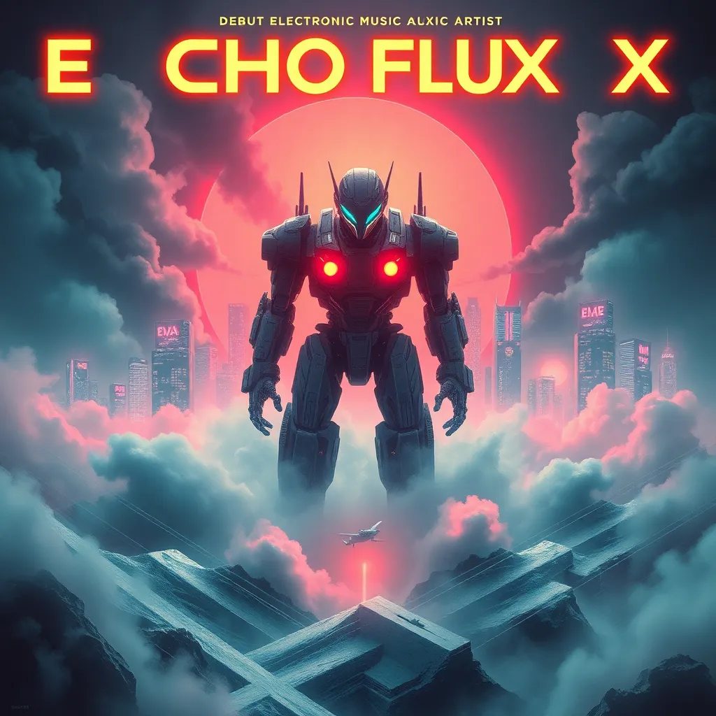 Create a futuristic album cover for a debut electronic music artist, 'Echo Flux', featuring a neon-lit cityscape with a giant robot rising from the depths of a polluted ocean, surrounded by swirling clouds of mist and smoke. Incorporate bold typography and vibrant colors to capture the artist's edgy, high-energy vibe.