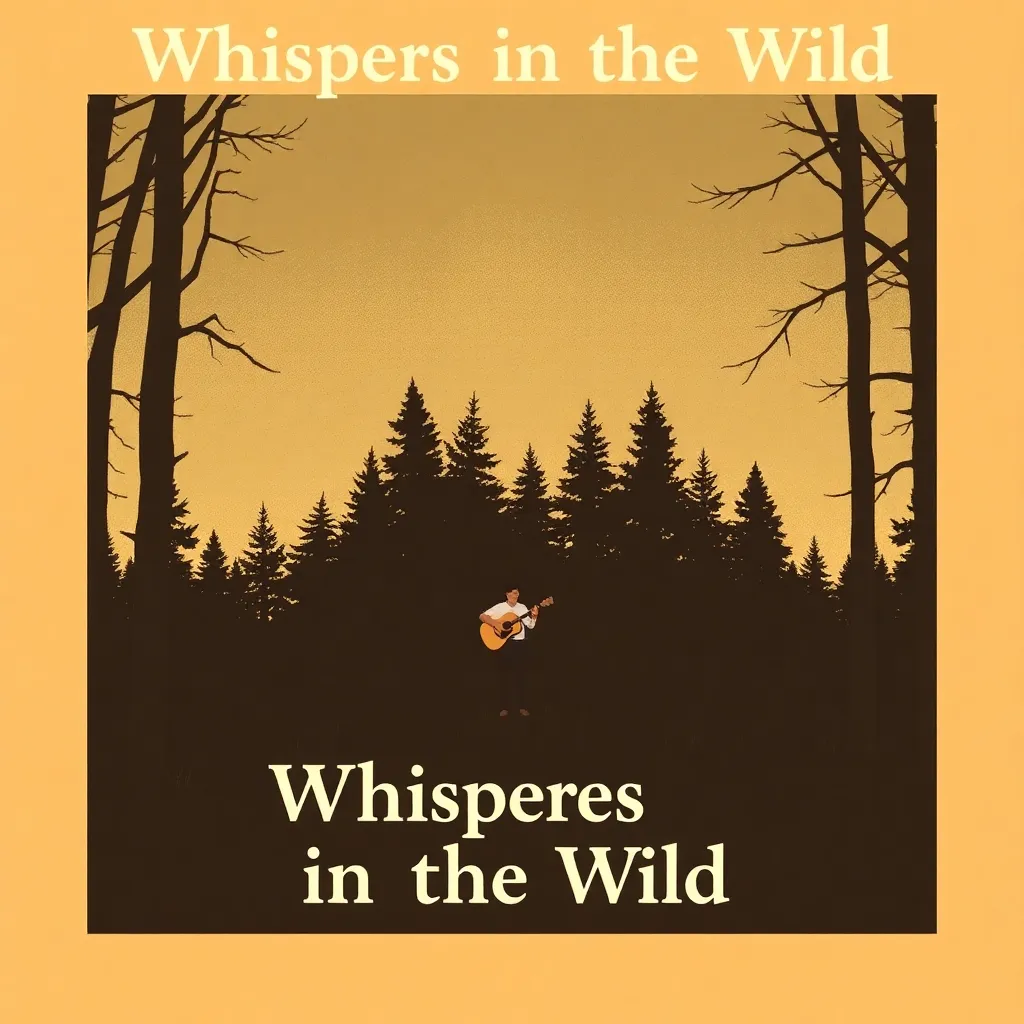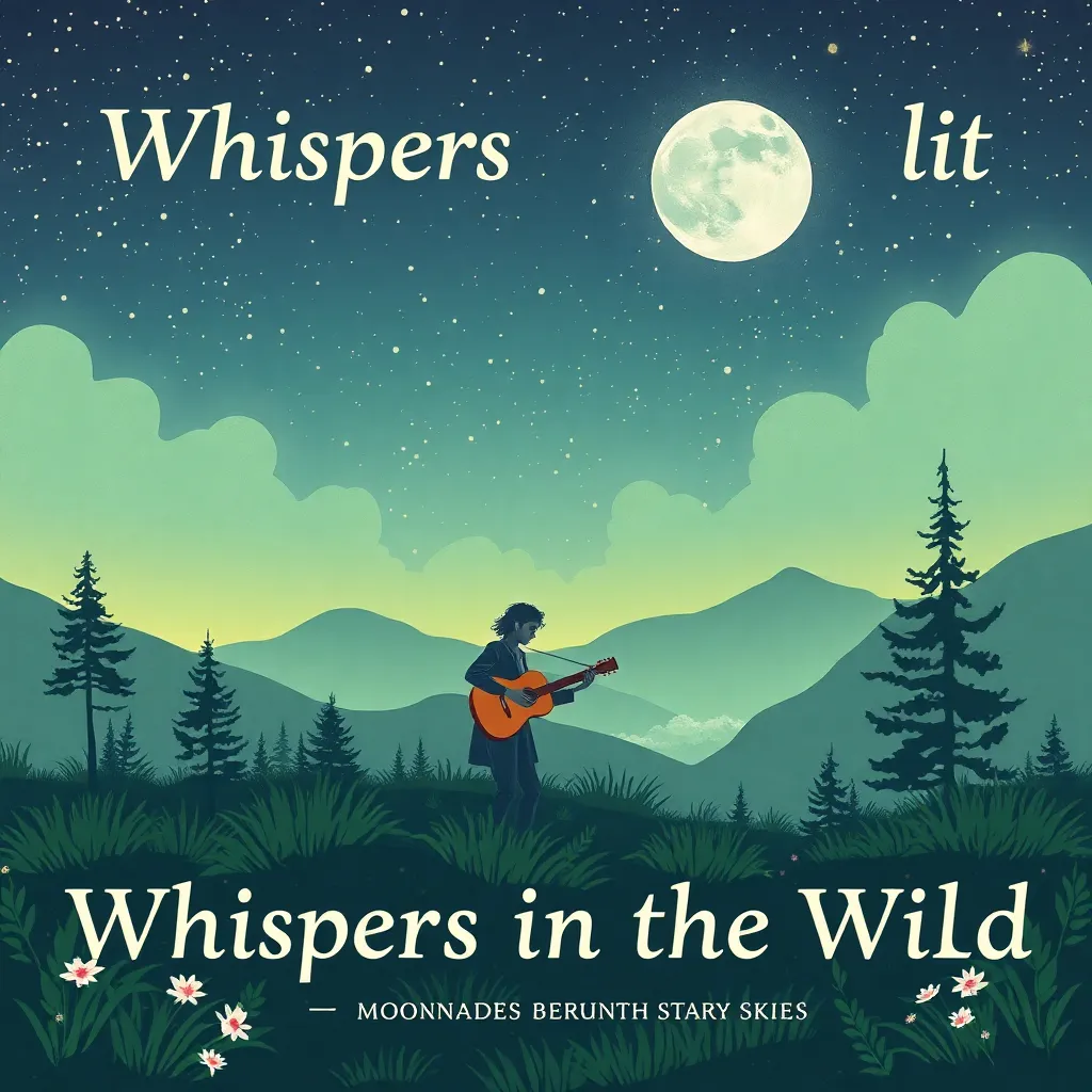 Create an album cover for a fictional indie folk band, 'Whispers in the Wind', featuring a mystical forest landscape with a lone figure playing a guitar under a full moon. Incorporate earthy tones, wispy clouds, and a sense of longing. The band's name and album title, 'Echoes in the Night', should be prominently displayed.