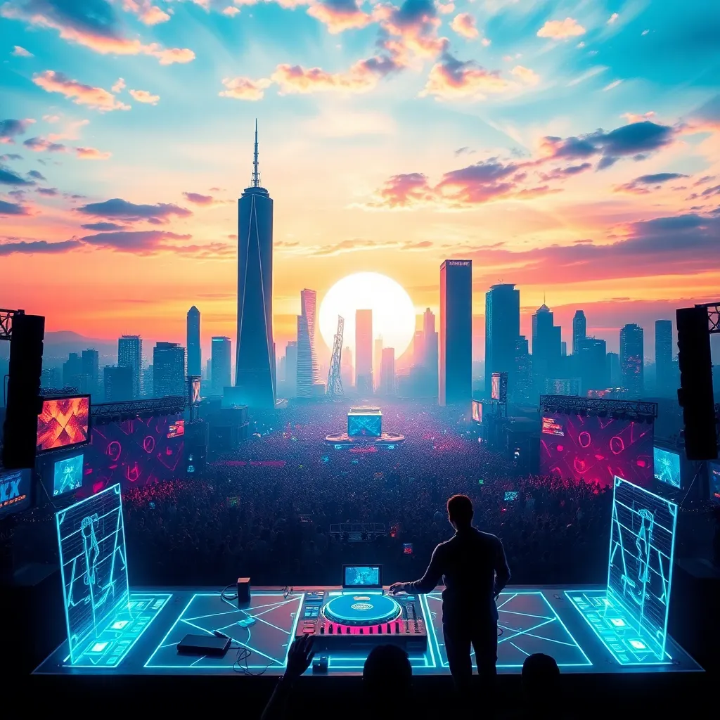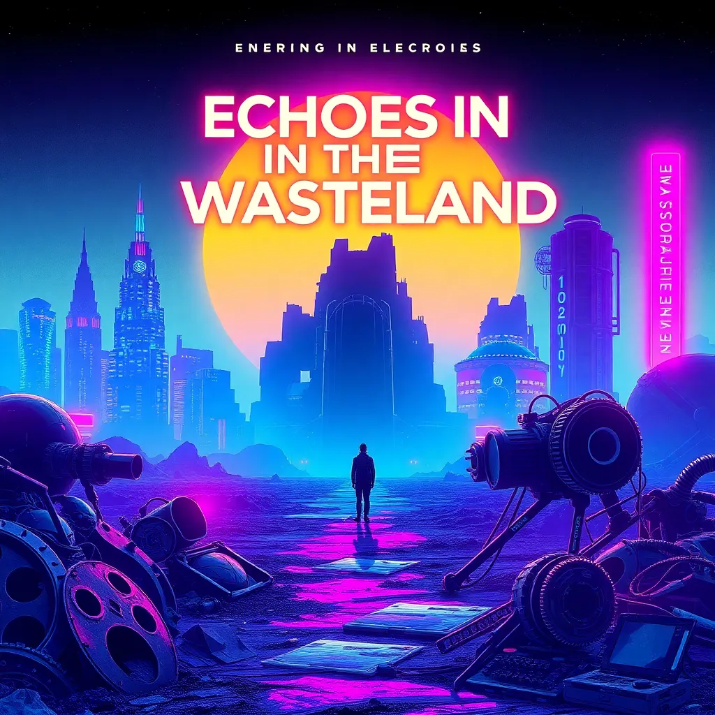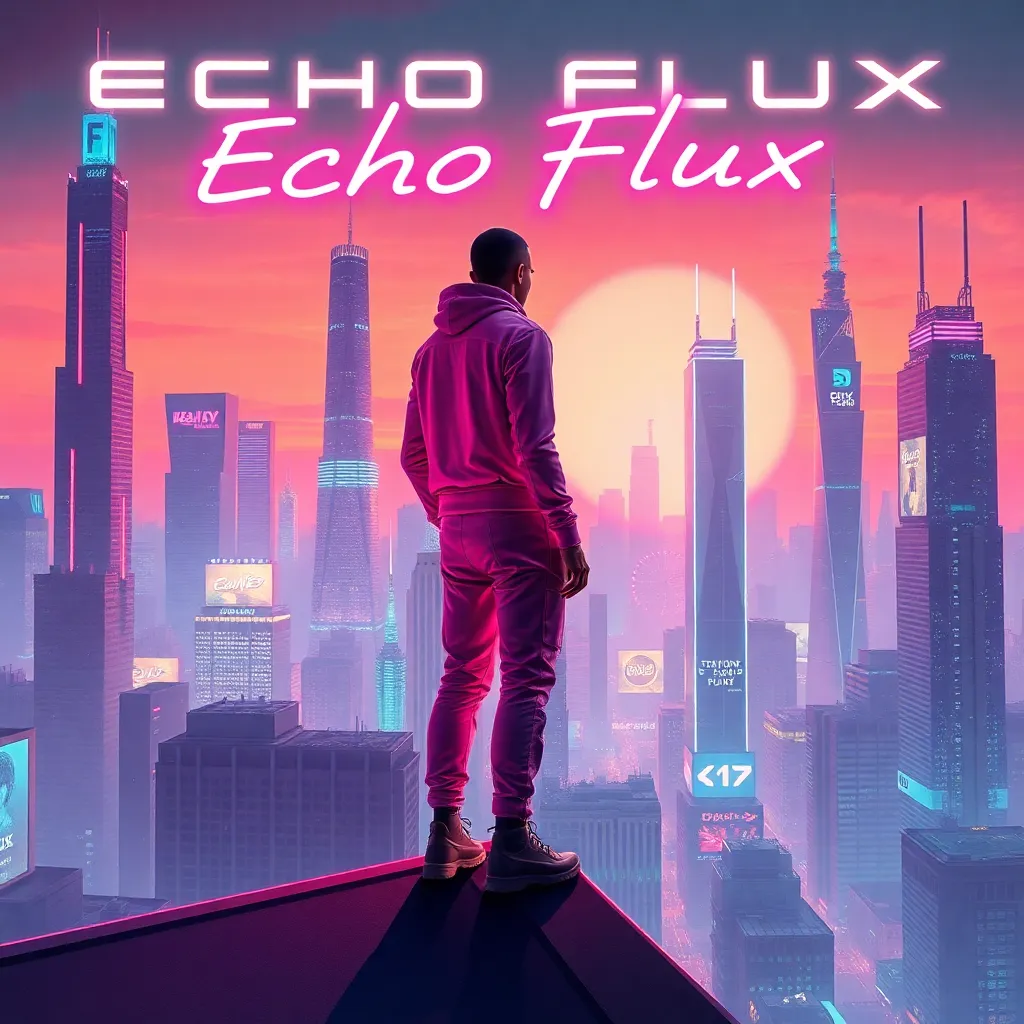 Create a futuristic, neon-lit album cover for a synth-pop band called 'Echo Flux'. The artwork should feature a cityscape at sunset, with towering skyscrapers and holographic advertisements. In the foreground, a lone figure in a futuristic jumpsuit stands on the edge of a rooftop, gazing out at the city