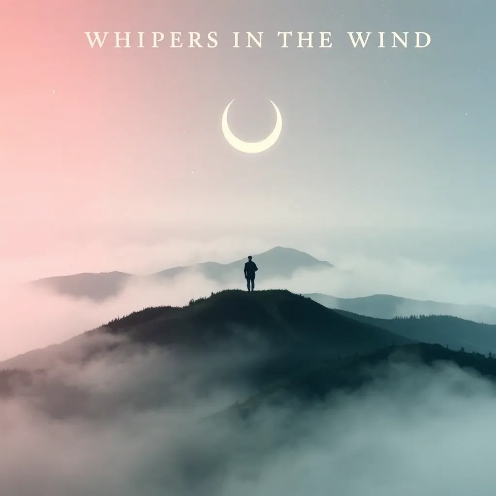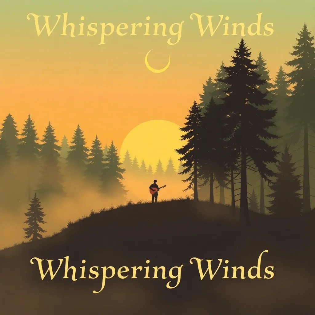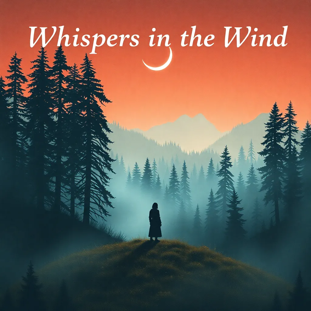 Design an album cover for a fictional indie-folk band, 'Whispers in the Wind', featuring a hauntingly beautiful landscape with a lone figure standing at the edge of a misty forest, surrounded by towering trees and a crescent moon hanging low in the sky. Incorporate earthy tones and mystical elements.