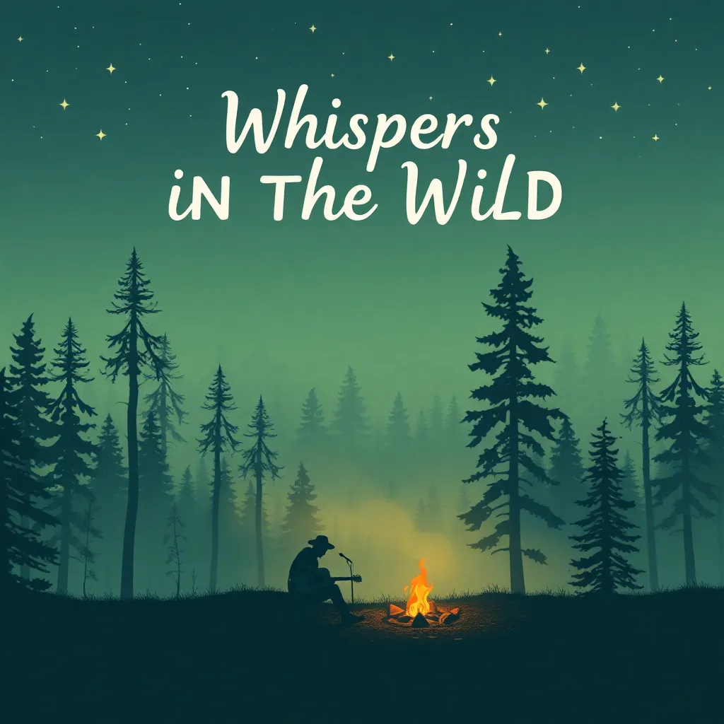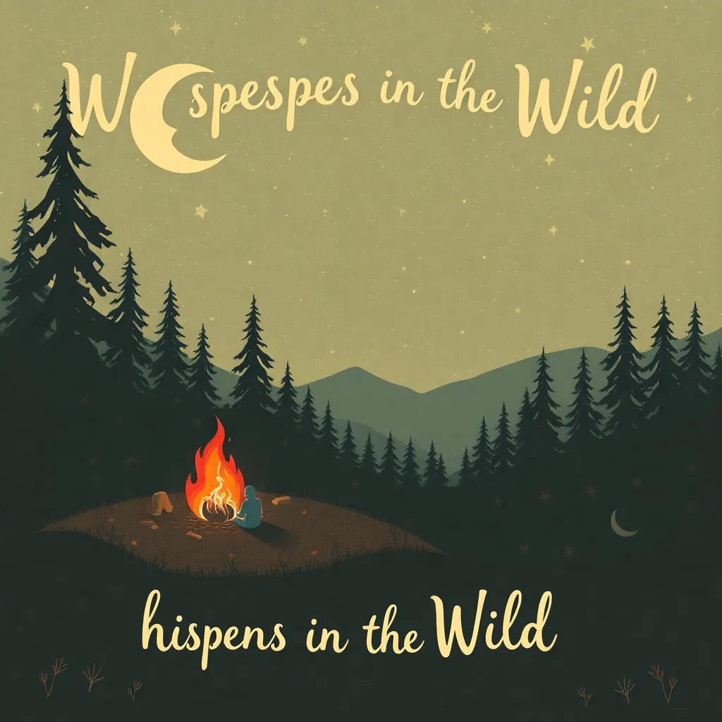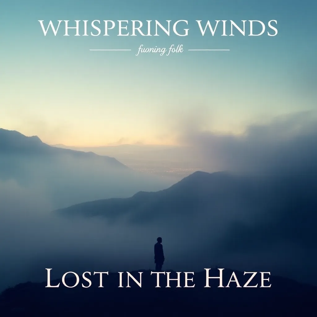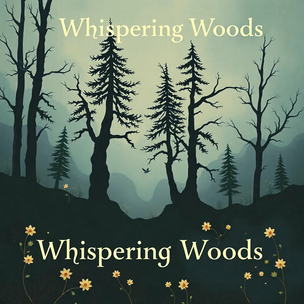 Design an album cover for a fictional indie-folk band, 'Whispers in the Wind', featuring a hauntingly beautiful landscape with a lone figure standing at the edge of a misty forest, surrounded by towering trees and a crescent moon hanging low in the sky. Incorporate earthy tones and mystical elements.