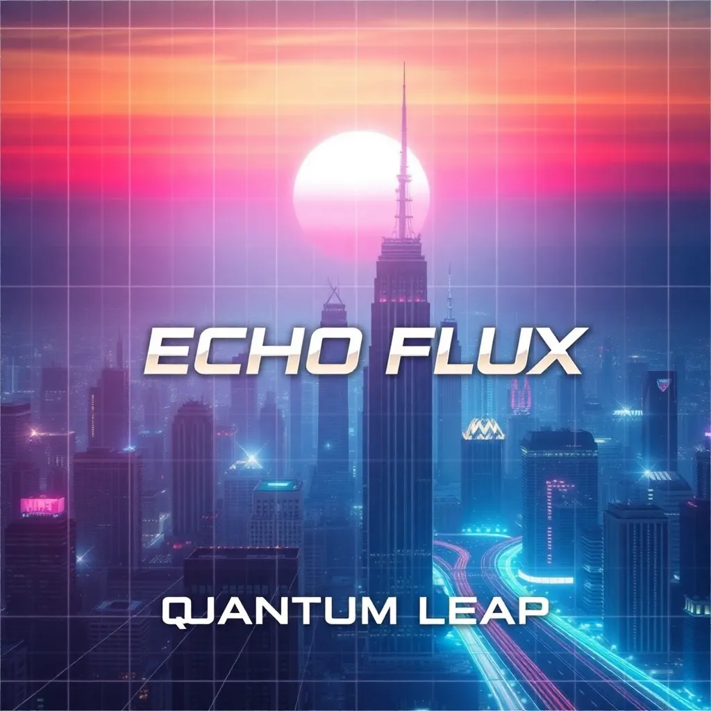 Create a futuristic album cover for a new electronic music artist, 'Echo Flux.' The image should feature a cityscape at sunset with neon-lit skyscrapers and a holographic grid overlay. Incorporate the artist's name and album title, 'Quantum Leap,' in bold, futuristic font. Add a sense of movement and energy to the design.