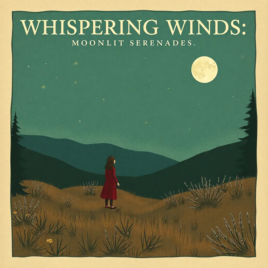 Create an album cover for a debut album by an indie folk band called 'Whispering Winds'. The album is titled 'Moonlit Serenades' and features a mix of melancholic and uplifting tracks. The cover should evoke a sense of nostalgia and wistfulness, with a focus on earthy tones and whimsical illustrations.