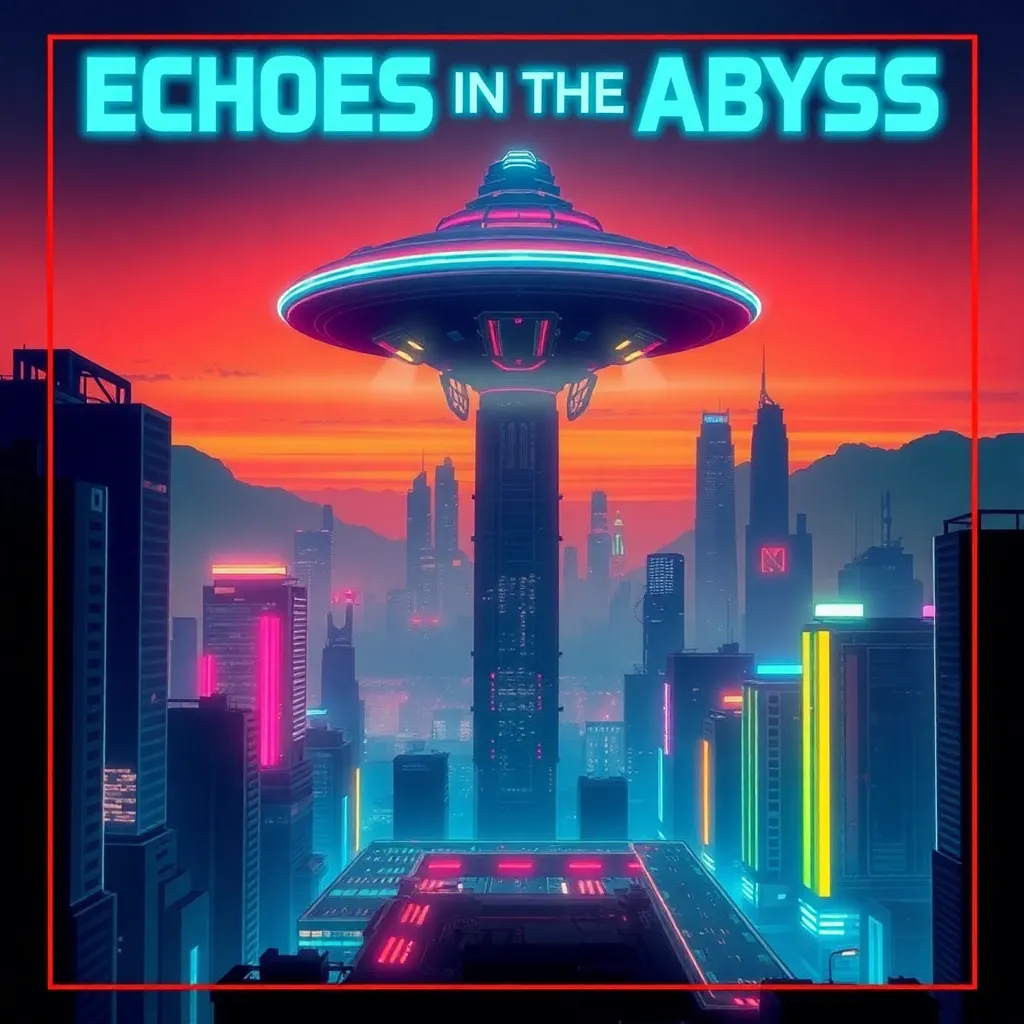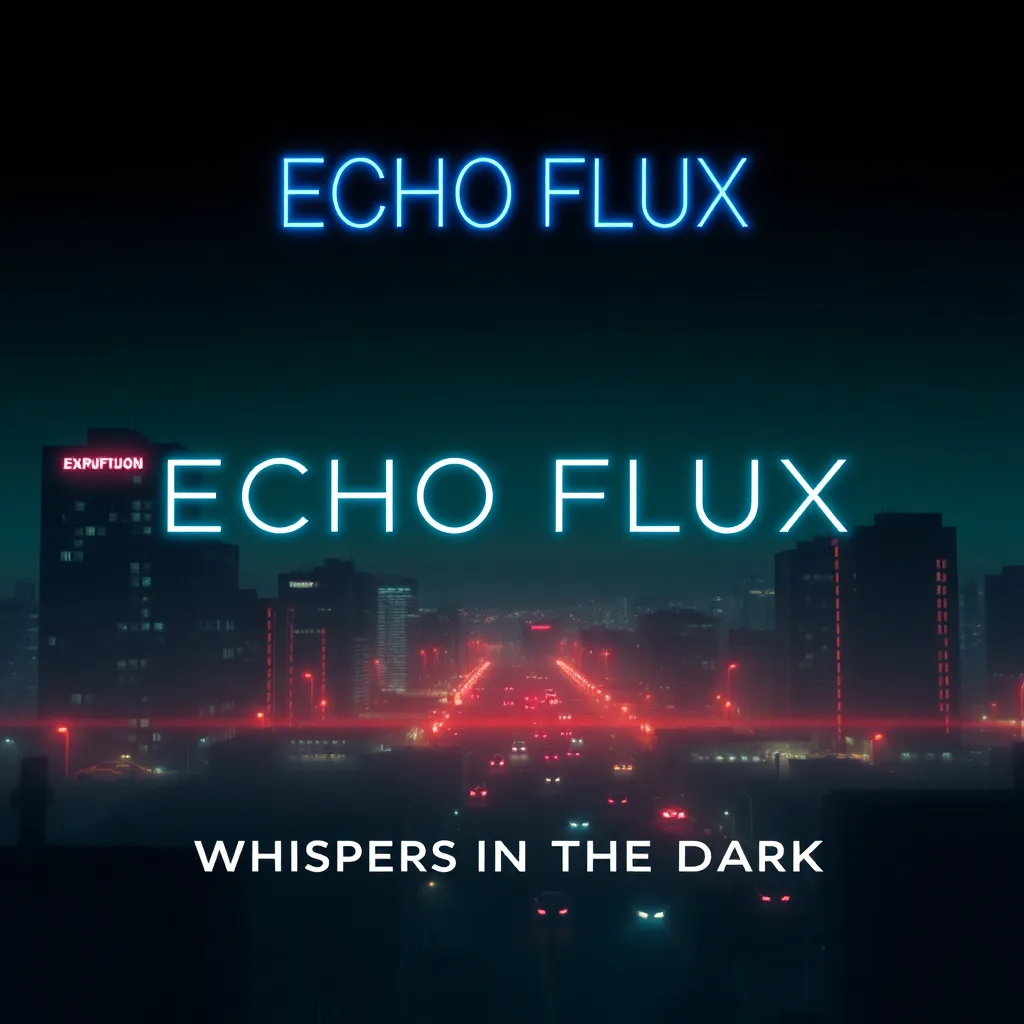 "Generate an album cover for Echo Flux's debut album 'Whispers in the Dark'. The image should feature a mysterious, neon-lit cityscape at dusk, with the band's name and album title in bold, futuristic font. Incorporate a subtle hint of surveillance or observation, reflecting the band's themes of technology and human connection.