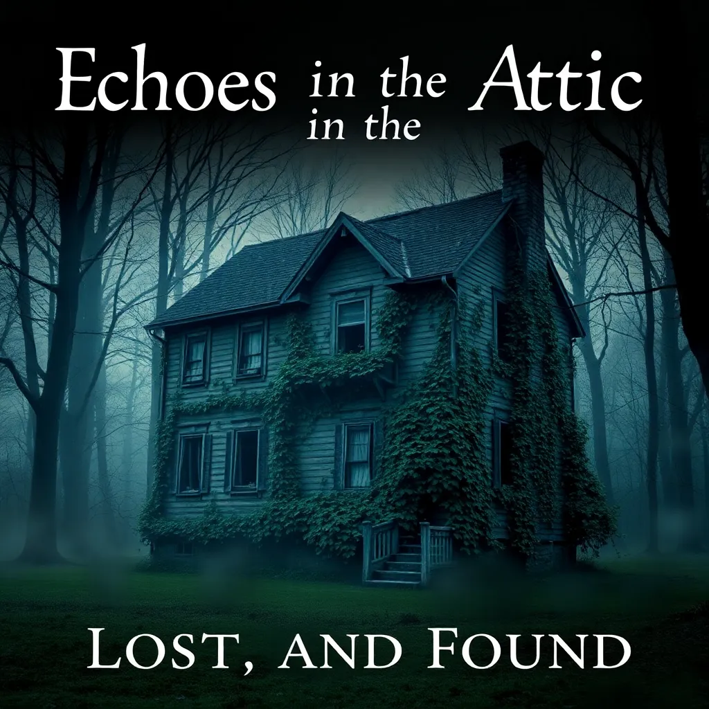 Create an album cover for a fictional indie-rock band, 'Echoes in the Attic'. The album is titled 'Lost and Found'. The cover should feature a hauntingly beautiful image of an old, abandoned house with vines crawling up the walls, surrounded by a misty forest at dusk. Incorporate a hint of nostalgia and longing.