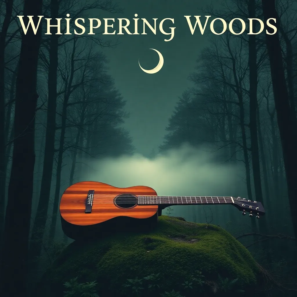 Create an album cover for 'Whispering Woods', a indie-folk band known for their earthy, acoustic sound. The cover should feature a serene forest scene with a crescent moon rising above the treetops, a guitar lying on a moss-covered rock, and a hint of misty fog rolling in. Capture the essence of nostalgia and peacefulness.