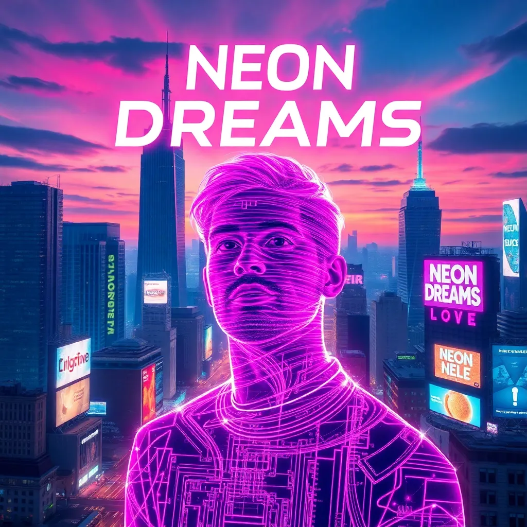 Create a futuristic album cover for a fictional electronic music artist, 'Neon Dreams'. The cover should feature a vibrant, neon-lit cityscape at dusk, with towering skyscrapers and holographic advertisements. Incorporate a stylized, glitch-art portrait of the artist in the foreground, surrounded by swirling patterns of light and energy.