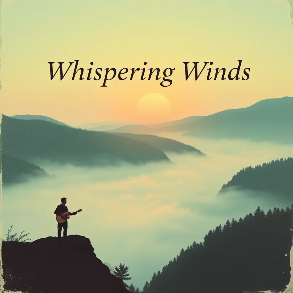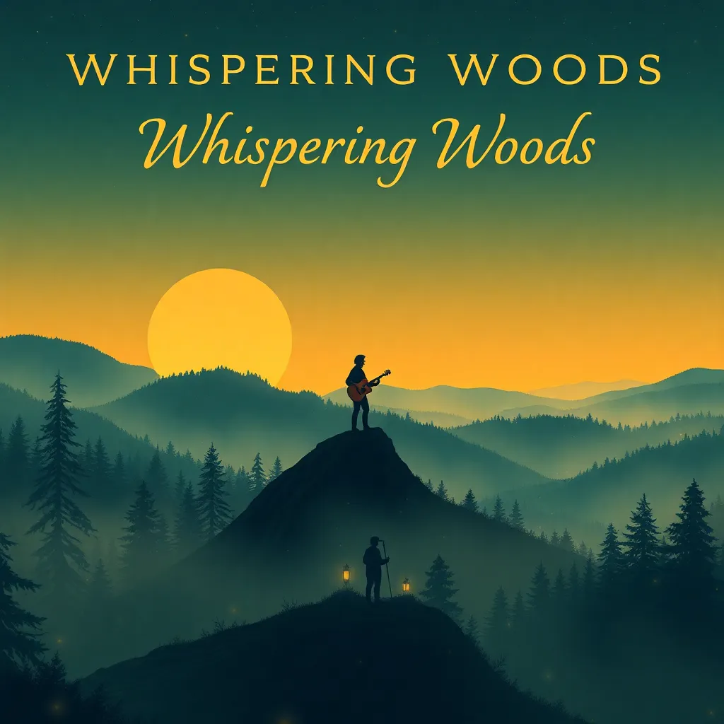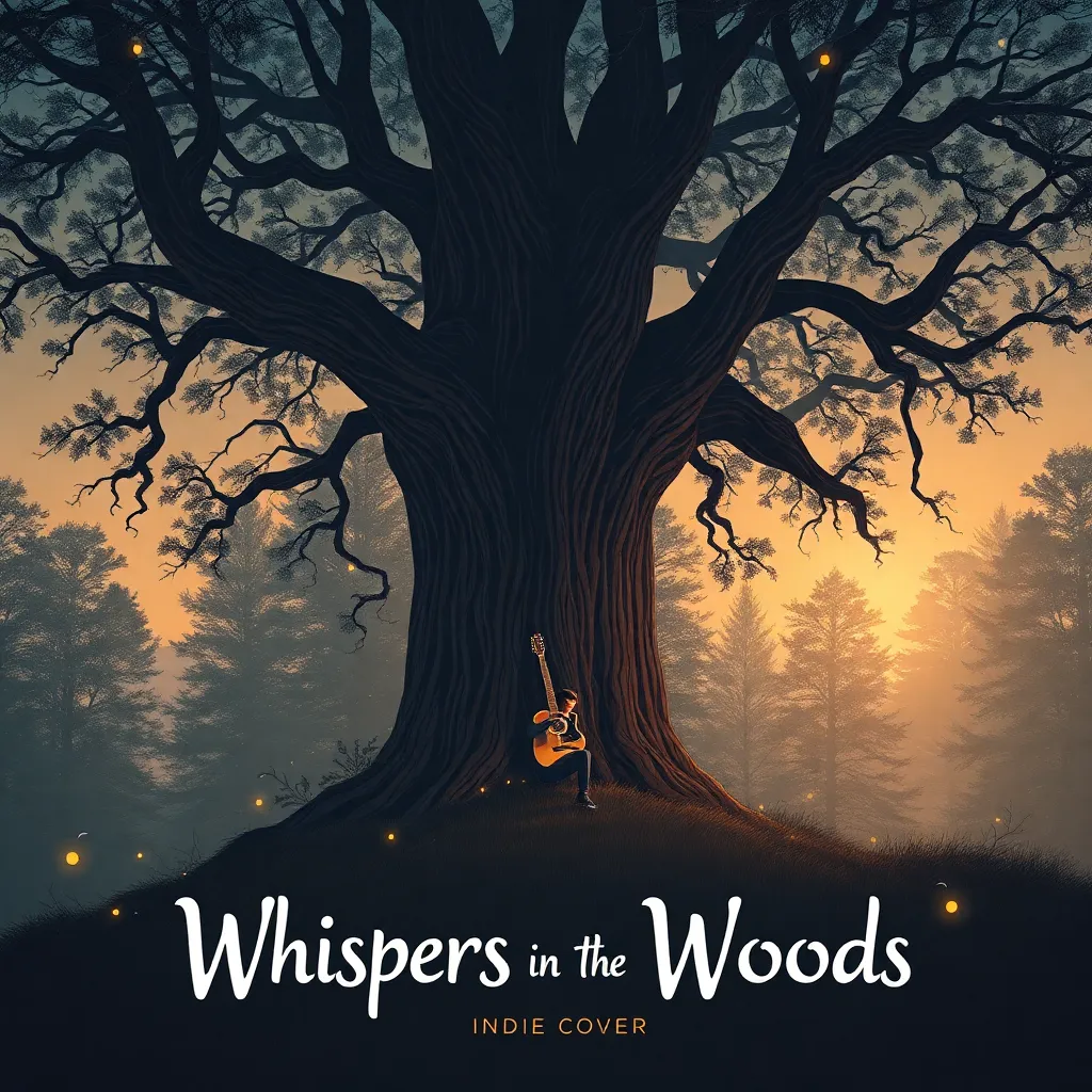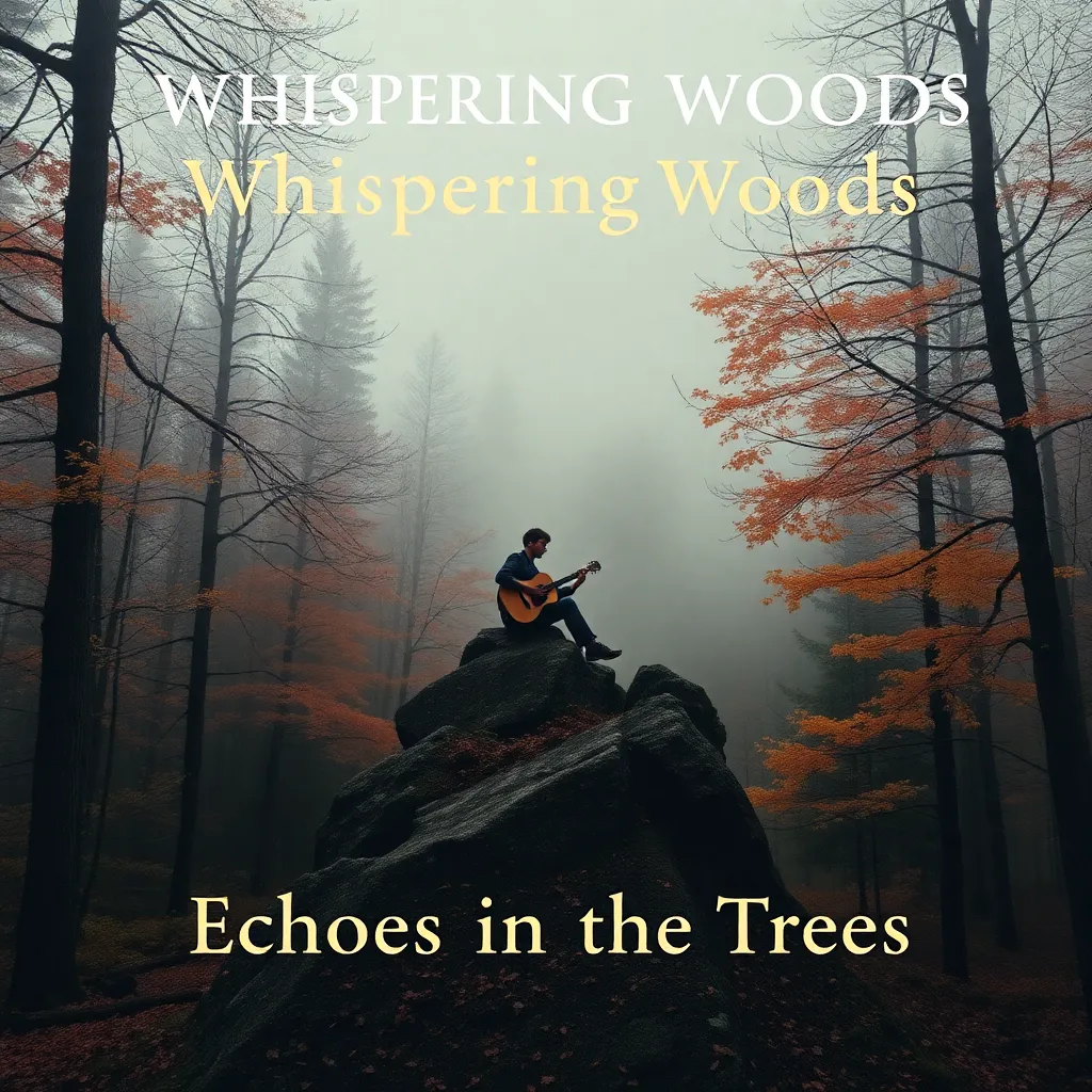 Create an album cover for a fictional indie folk band called 'Whispering Woods' featuring a serene forest landscape with a lone guitarist sitting on a rocky outcropping, surrounded by misty fog and vibrant autumn leaves, with the title 'Echoes in the Trees' and a minimalist font in a warm, earthy tone.