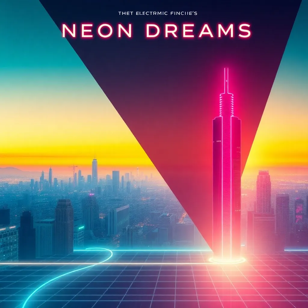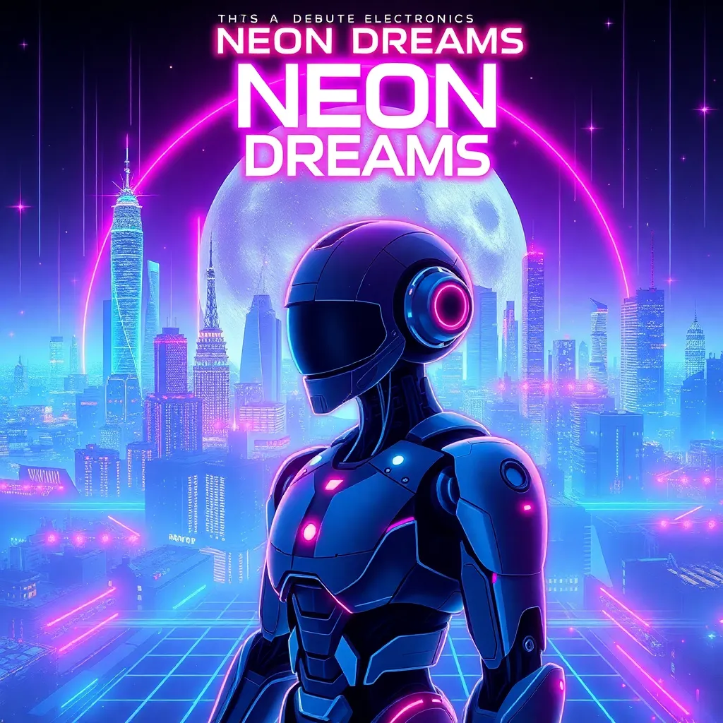 Create a futuristic album cover for a debut electronic music album titled 'Neon Dreams'. Incorporate neon-lit cityscapes, holographic patterns, and a stylized robotic figure in the foreground. The color palette should be a mix of blues, purples, and neon pinks. The overall design should evoke a sense of innovation and otherworldliness.