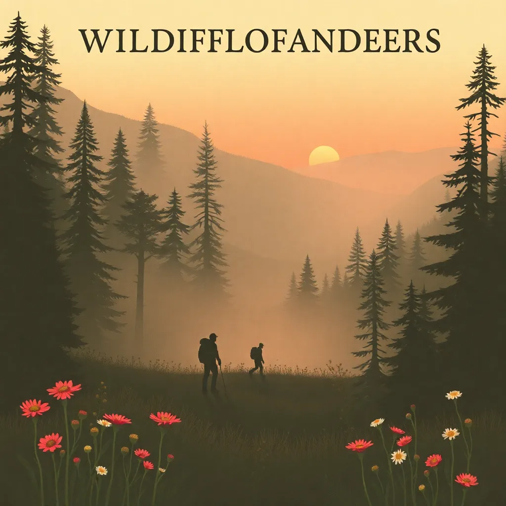 Create an album cover for a fictional indie folk band, 'Wildflower Wanderers', inspired by the American wilderness. Incorporate a serene landscape of a misty forest at sunrise, with a faint figure of a hiker in the distance, surrounded by wildflowers and a crescent moon. Use earthy tones and whimsical typography.
