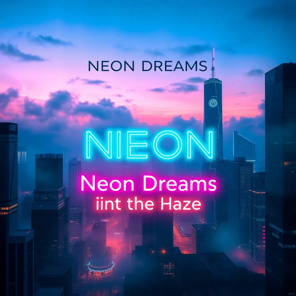 Design a futuristic album cover for a fictional electronic music artist, 'Neon Dreams', featuring a cityscape at dusk with neon-lit skyscrapers and a misty atmosphere. Incorporate the artist's name and album title 'Echoes in the Haze' in a bold, neon-colored font. Incorporate subtle hints of technology and innovation.