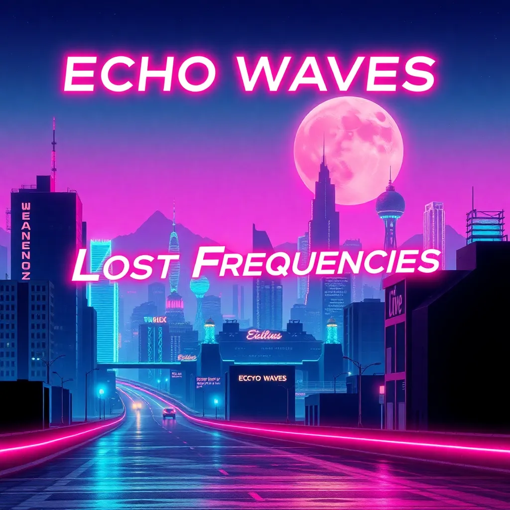 Create a futuristic album cover for a fictional indie rock band 'Echo Waves' that blends 80s synthwave and ambient electronic elements. Incorporate neon-lit cityscapes, retro-futuristic architecture, and subtle hints of nostalgia. The title 'Lost Frequencies' should be prominently displayed in bold, neon-lit font.