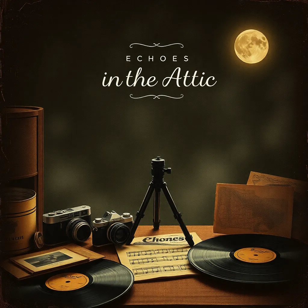 Create an album cover for a fictional indie-rock band 'Echoes in the Attic' with a theme of nostalgia and longing. Incorporate vintage elements, such as old cameras, vinyl records, and worn-out photographs, with a subtle hint of moonlight and a misty atmosphere. The cover should evoke a sense of wistfulness.
