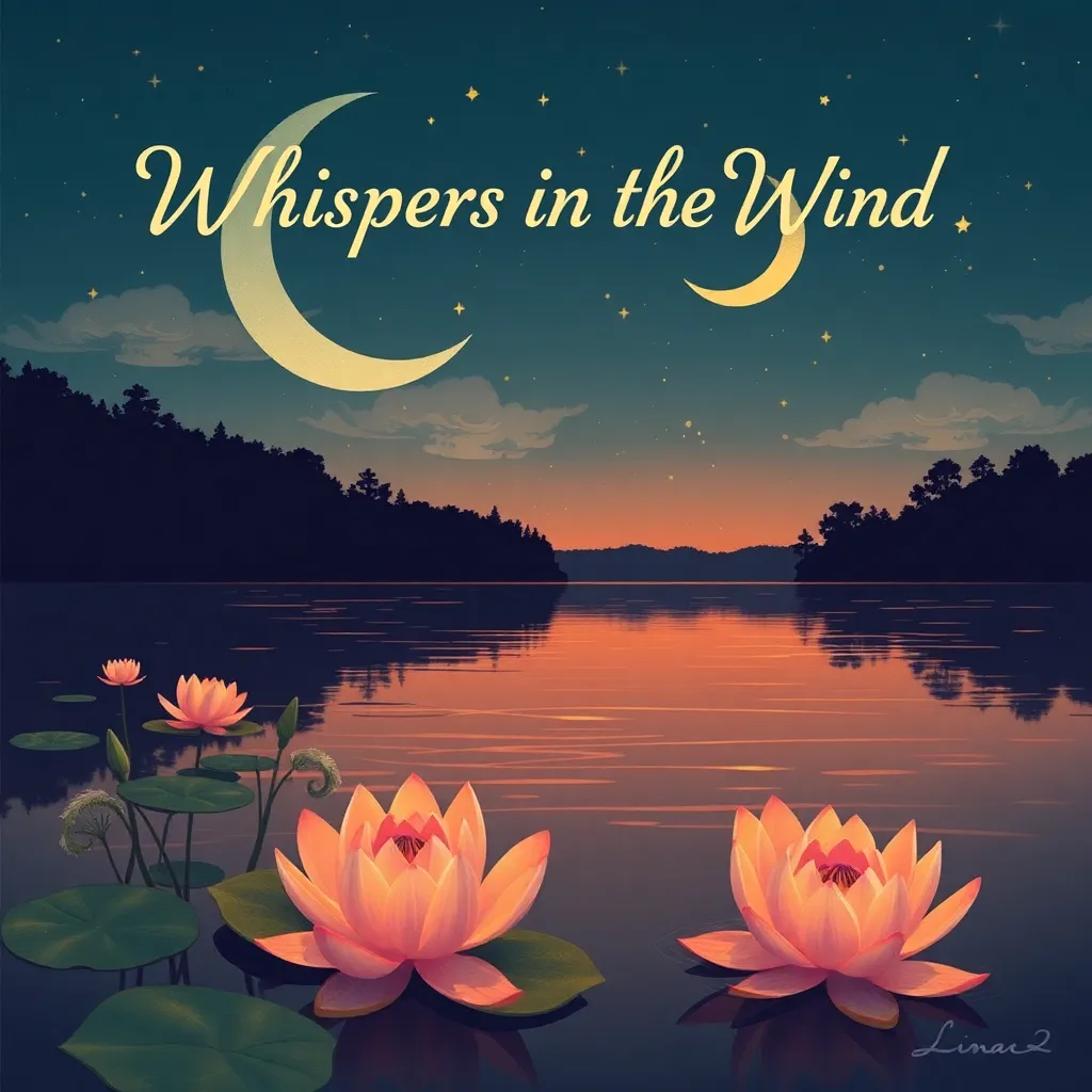 Create an album cover for a fictional indie-folk band 'Whispers in the Woods' that evokes a sense of mystique and nostalgia. The cover should feature a serene forest landscape at dusk, with a hint of moonlight and a subtle mist. Incorporate the band's name and album title 'Echoes of Twilight' in a whimsical, handwritten font.