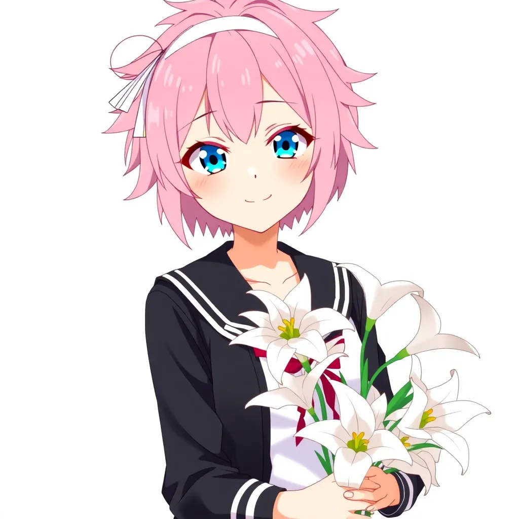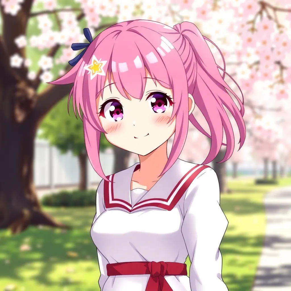 Create a young, energetic anime girl with bright pink hair and matching eyes. She wears a flowing white school uniform with a crimson sash and has a confident smile. Add a sparkly star-shaped accessory on her forehead and a few strands of loose hair framing her face. Her background is a sunny park with blooming cherry blossoms.