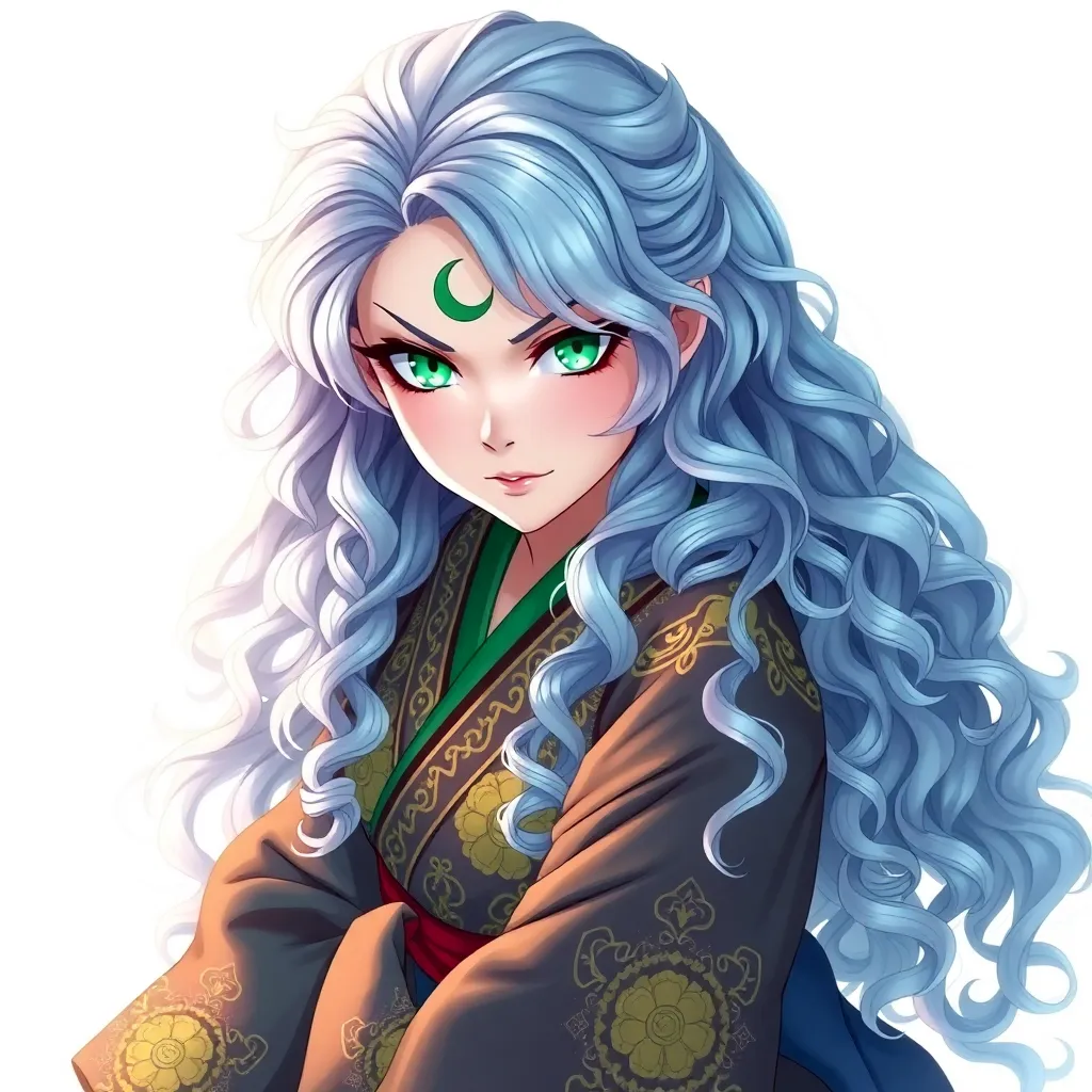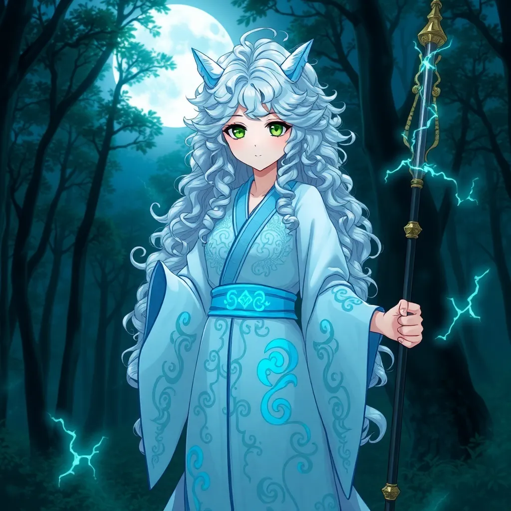 Create a unique anime character with a mystical aura. She has long, curly silver hair and piercing emerald green eyes. Her outfit is a flowing white kimono with intricate, glowing blue patterns. She holds a staff that crackles with magical energy. Generate an image of her standing amidst a moonlit forest.