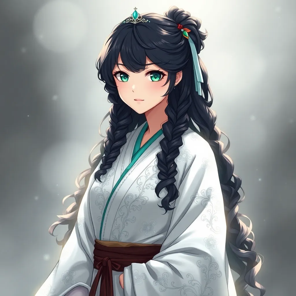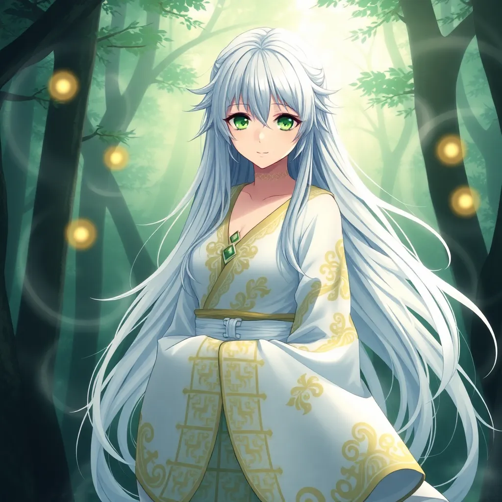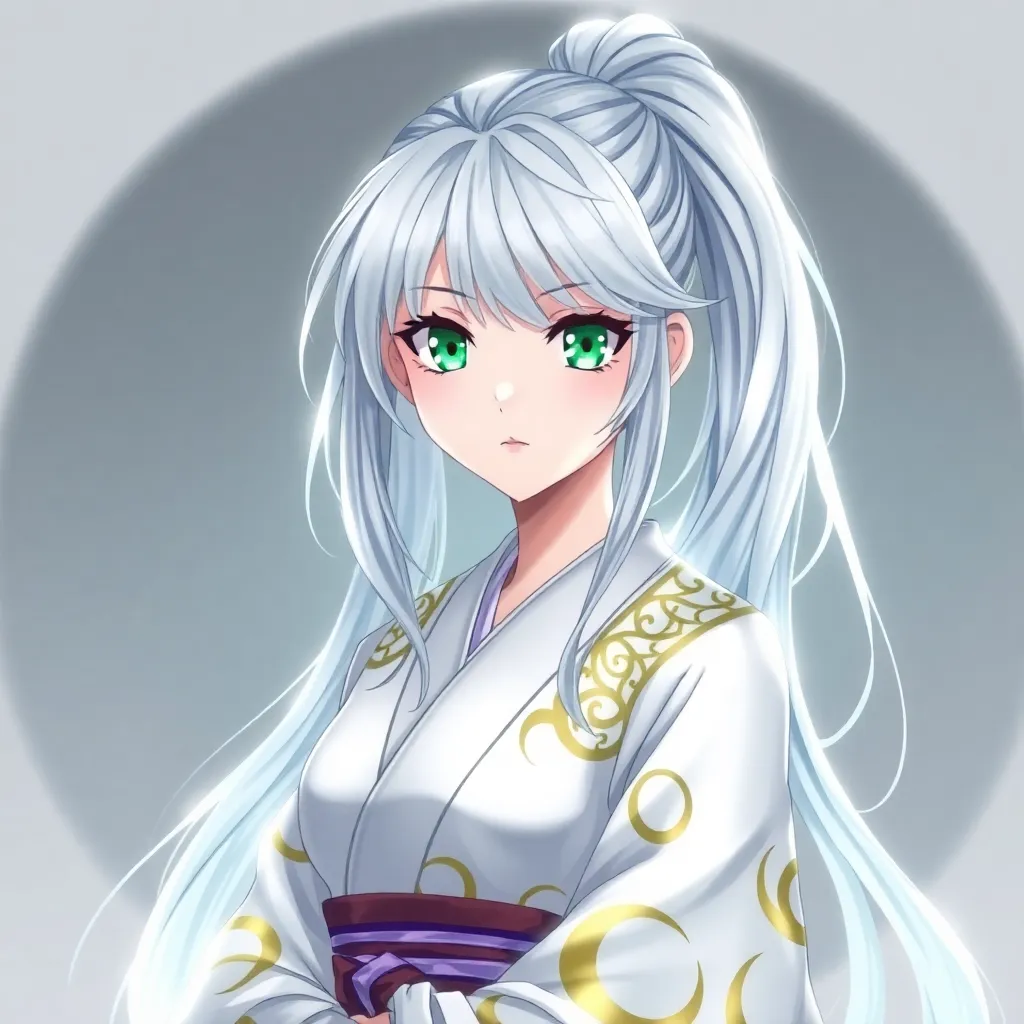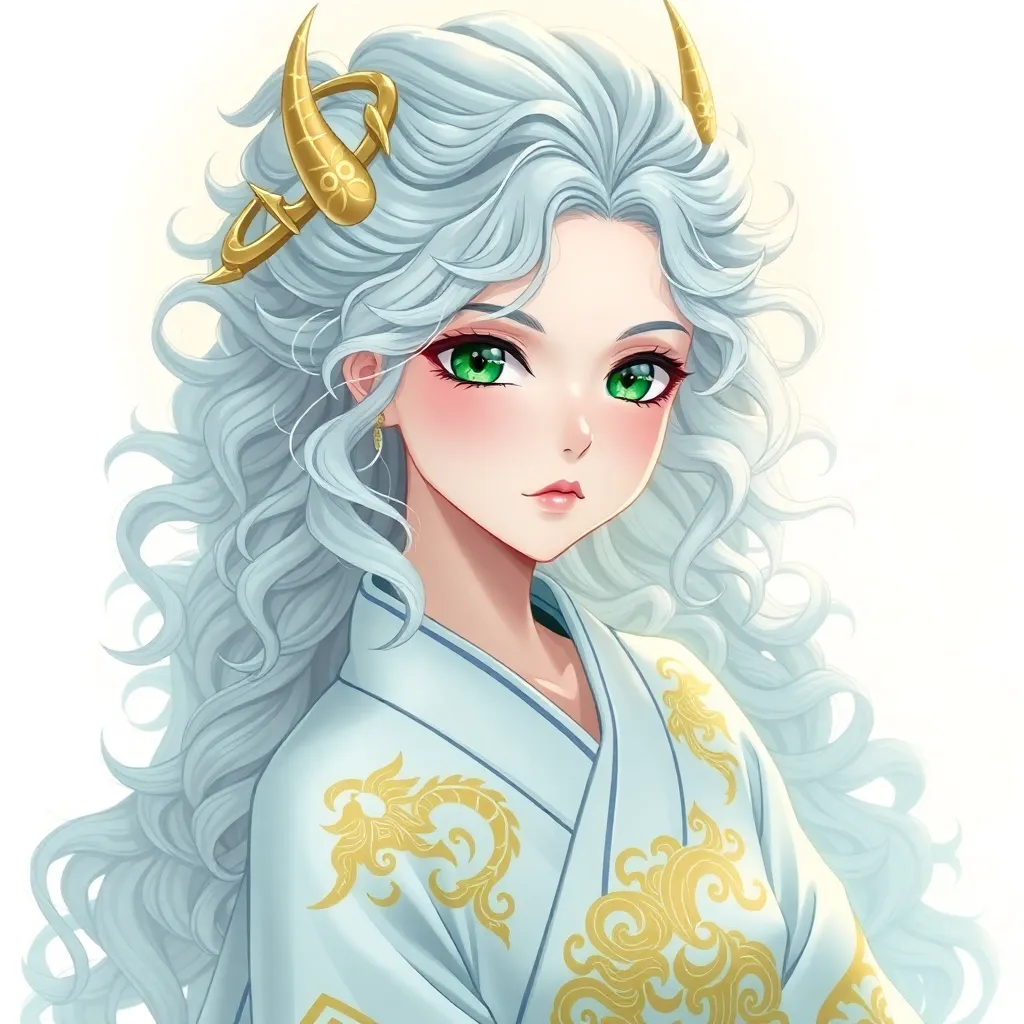 Create a stunning anime character inspired by Japanese folklore. Design a young woman with long, curly silver hair and piercing emerald eyes. She wears a flowing white kimono with intricate golden designs, surrounded by a soft aura of mystical energy. Incorporate subtle hints of mythical creatures in her attire.