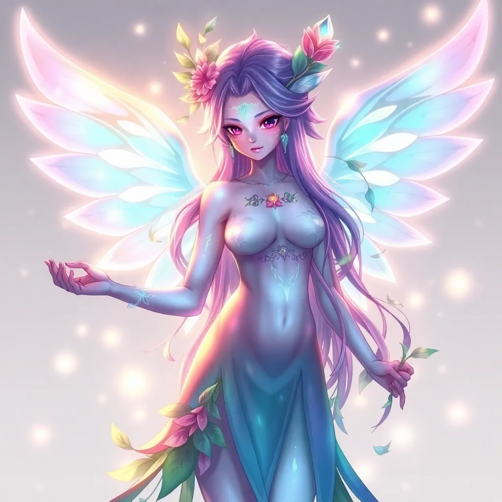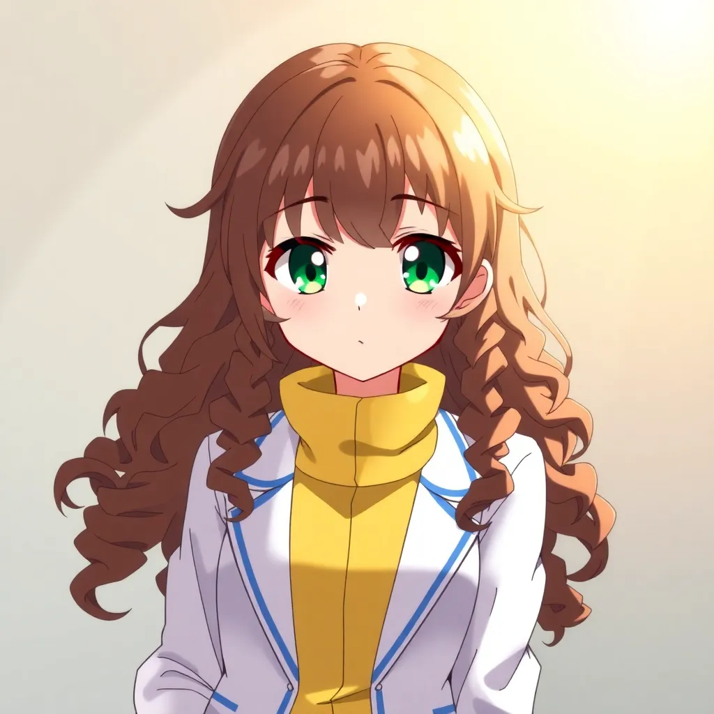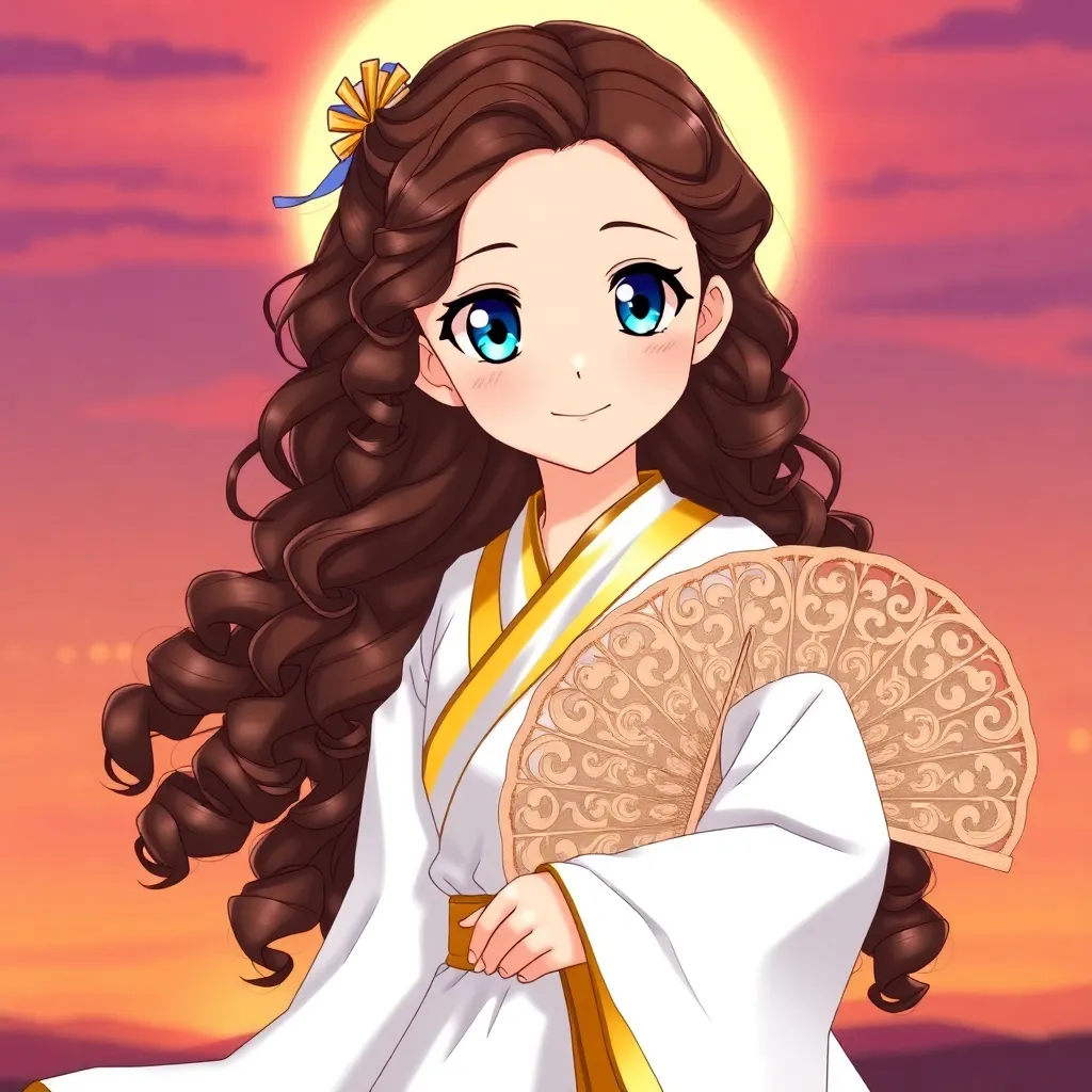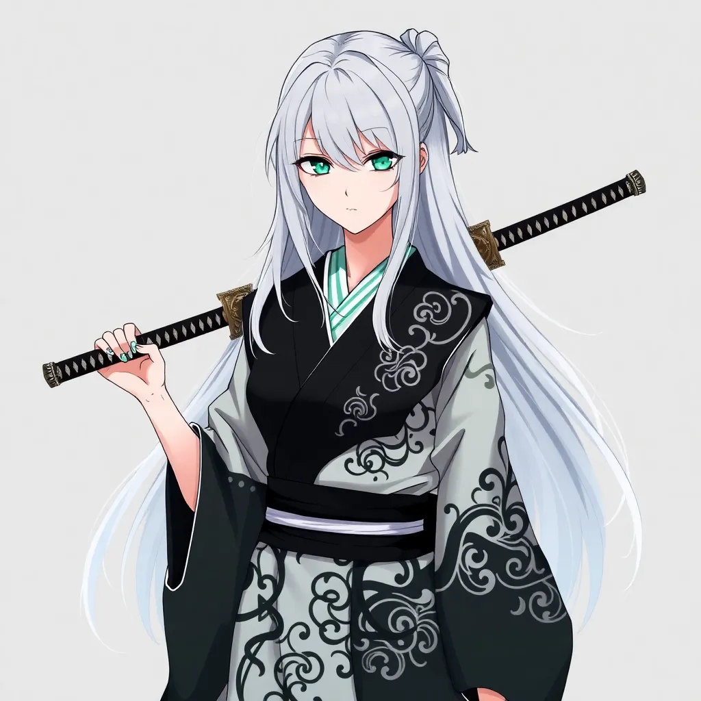 Create a stunning anime character inspired by Japanese folklore. Design a young woman with long, curly silver hair and piercing emerald eyes. She wears a flowing white kimono with intricate golden designs, surrounded by a soft aura of mystical energy. Incorporate subtle hints of mythical creatures in her attire.