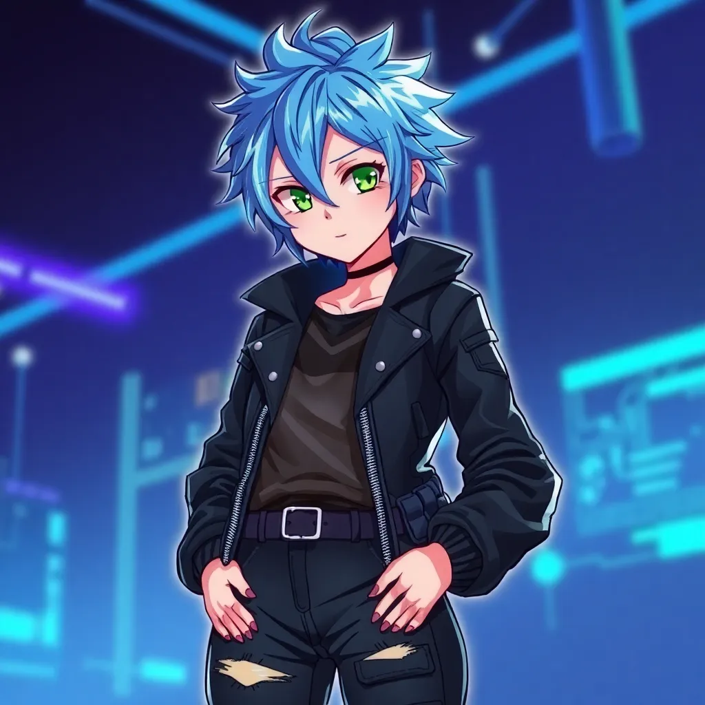 Create a futuristic anime character with a cyberpunk twist. She's a skilled hacker with short, spiky blue hair and piercing green eyes. Her outfit consists of a black leather jacket, ripped jeans, and chunky boots. She's standing in front of a neon-lit cityscape, with a tablet and wires visible in the background.
